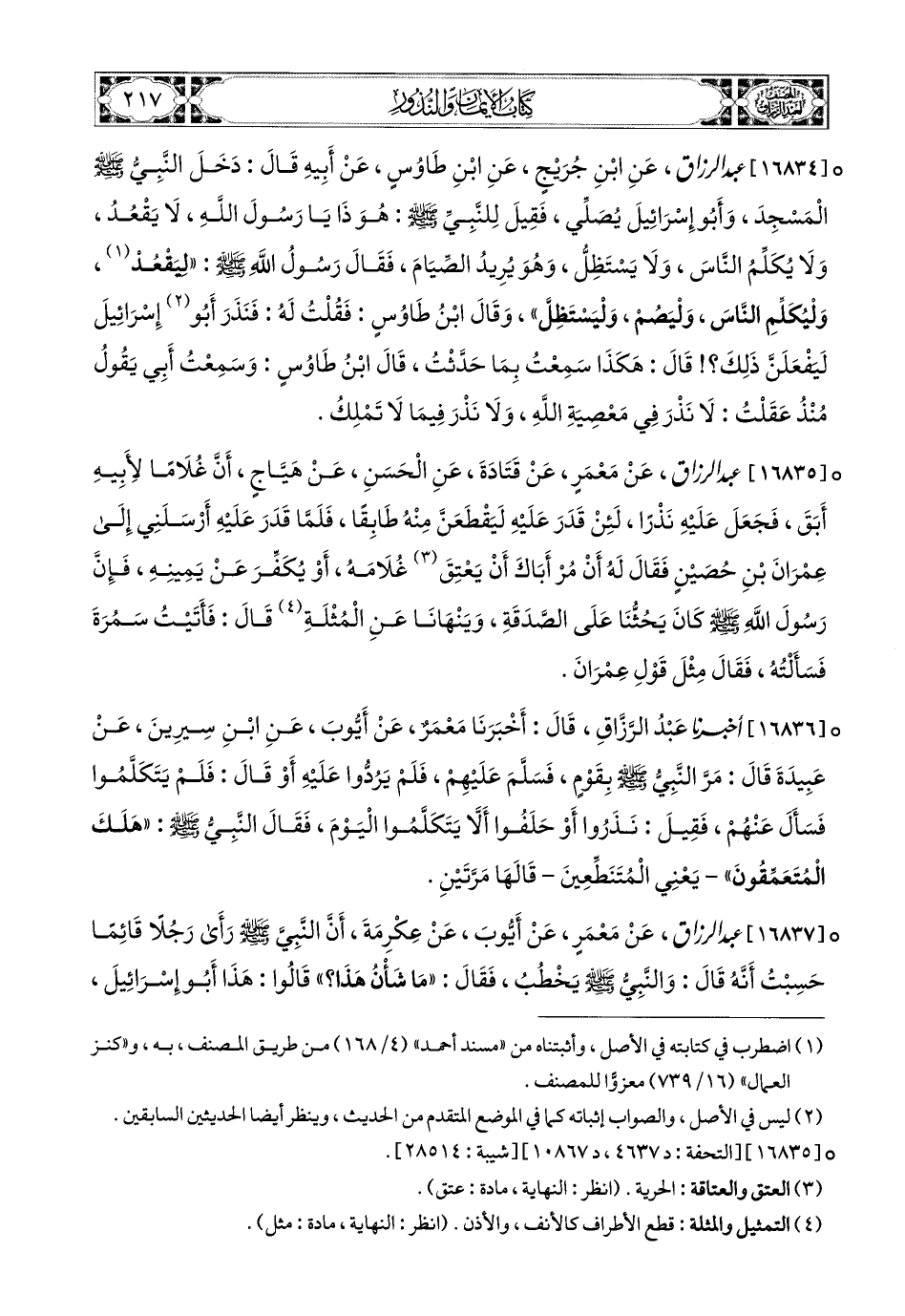 - عَبد الرَّزَّاقِ، أَخبَرنا مَعْمَرٌ، عَن أَيُّوبَ، عَن أَبِي قِلاَبَةَ، عَن عِمْرَانَ بنِ الْحُصَيْنِ، قد كتبته في العقول] (1).