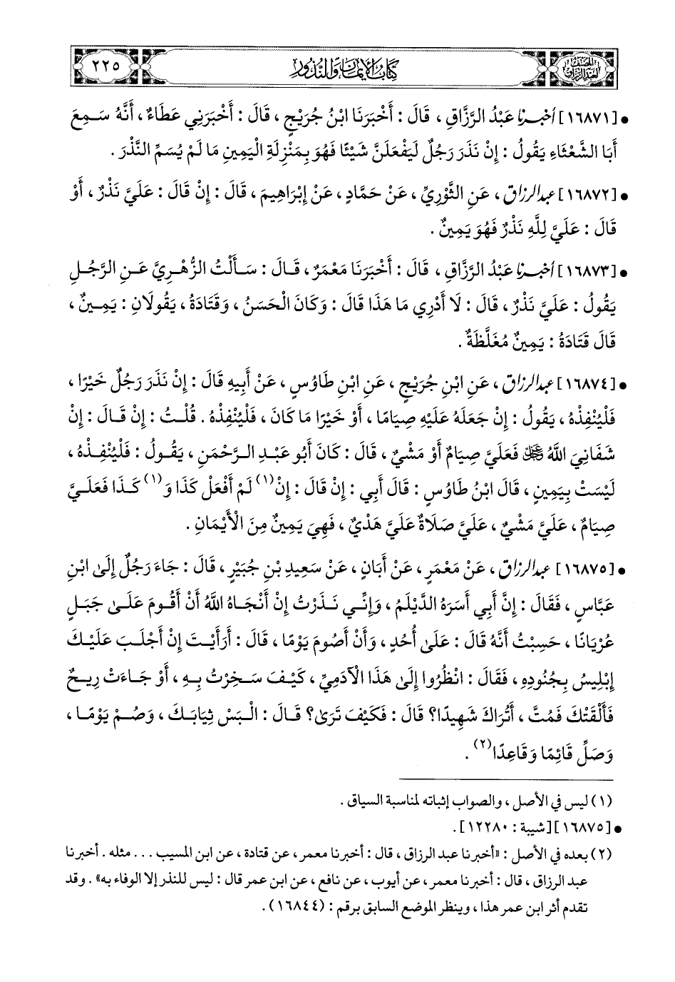 - عَبد الرَّزَّاقِ، أَخبَرنا مَعْمَرٌ، عَن أَيُّوبَ، عَن نَافِعٍ، عَنِ ابنِ عُمَرَ، قَالَ: ليس للنذر إلاَّ الوفاء به] (1).