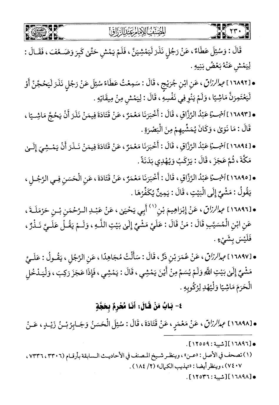 16893- أخبرنا عبد الرزاق، قَالَ: أَخْبَرَنَا مَعْمَرٌ، عَن قَتَادَةَ، فِيمَنْ نَذَرَ أَنْ يَحُجَّ مَاشِيًا، قَالَ: مَا نَوَى، وَكَانَ يُمَشِّيهِمْ مِنَ الْبَصْرَةِ.