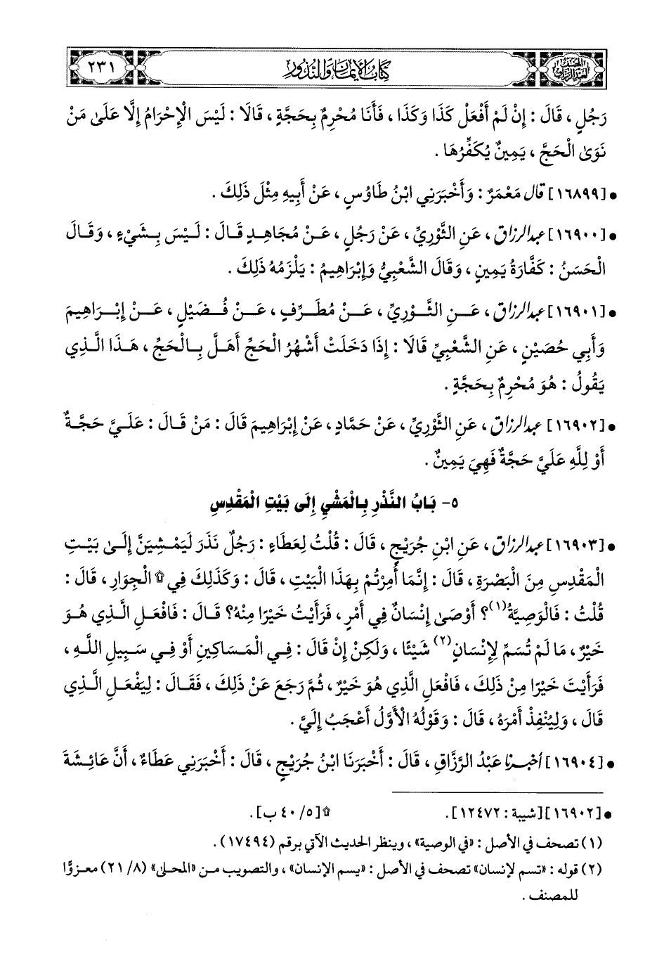 5- بَابٌ: النَّذْرُ بِالمَشْيِ إِلَى بَيْتِ المَقْدِسِ.