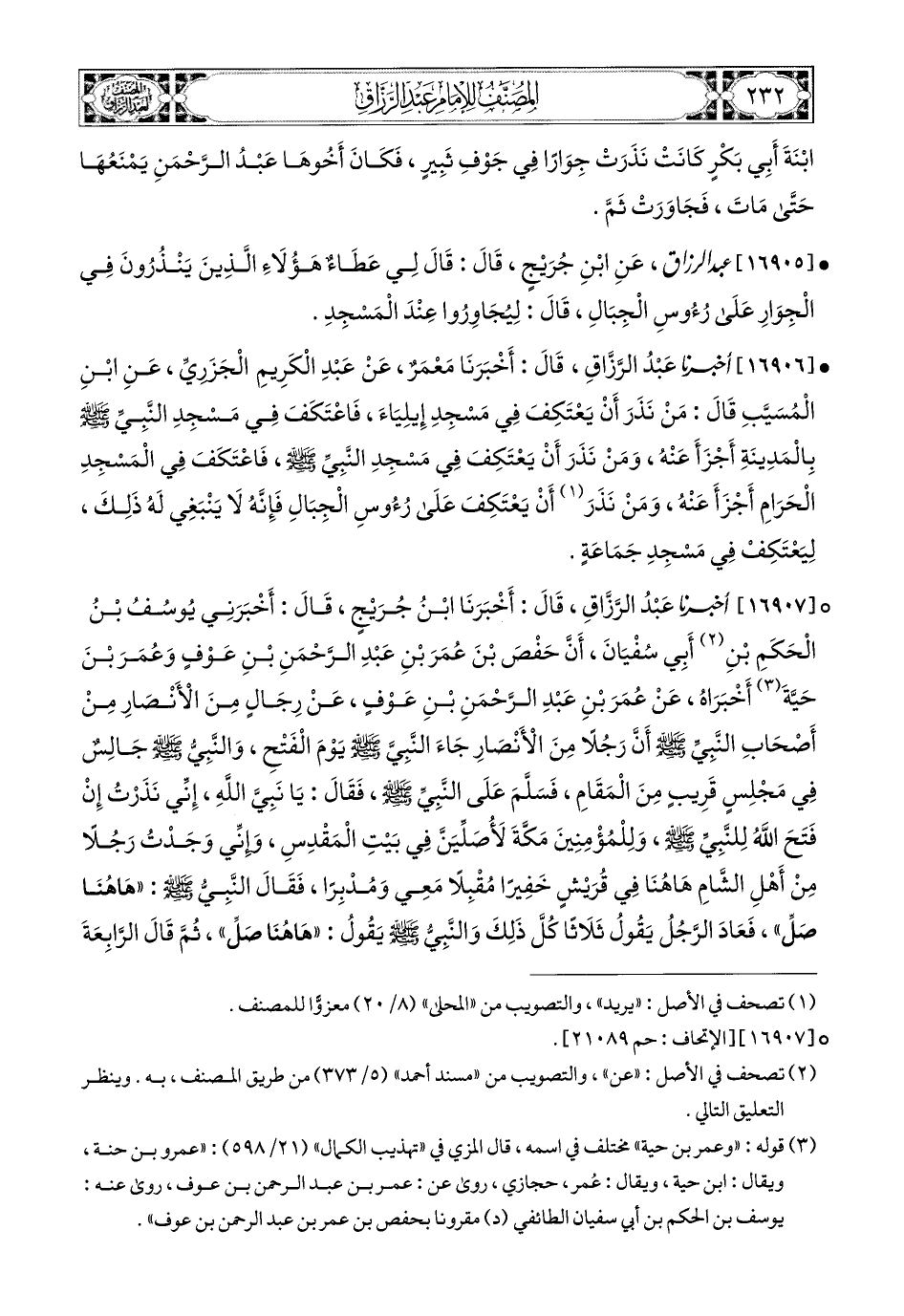 16906- أخبرنا عبد الرزاق، قَالَ: أَخْبَرَنَا مَعْمَرٌ، عَنْ عَبدِ الْكَرِيمِ الْجَزَرِيِّ، عَنِ ابْنِ المُسَيَّبِ، قَالَ: مَنْ نَذَرَ أَنْ يَعْتَكِفَ فِي مَسْجِدِ إِيلِيَاءَ، فَاعْتَكَفَ فِي مَسْجِدِ النَّبِيِّ صَلَّى اللهُ عَلَيْهِ وَسَلَّمَ بِالمَدِينَةِ أَجْزَأَ عَنْهُ، وَمَنْ نَذَرَ أَنْ يَعْتَكِفَ فِي مَسْجِدِ النَّبِيِّ صَلَّى اللهُ عَلَيْهِ وَسَلَّمَ، فَاعْتَكَفَ فِي المَسْجِدِ الْحَرَامِ، أَجْزَأَ عَنْهُ، وَمَنْ نَذَرَ أَنْ يَعْتَكِفَ عَلَى رُؤُوسِ الْجِبَالِ، فَإِنَّهُ لاَ يَنْبَغِي لَهُ ذَلِكَ، لِيَعْتَكِفْ فِي مَسْجِدِ جَمَاعَةٍ.