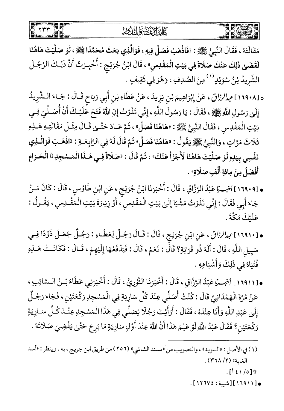 16908- عبد الرزاق، عَن إِبرَاهِيمَ بْنِ يَزِيدَ، عَنْ عَطَاءِ بْنِ أَبِي رَبَاحٍ قَالَ: جَاءَ الشَّرِيدُ إِلَى رَسُولِ اللهِ صَلَّى اللهُ عَلَيْهِ وَسَلَّمَ، فَقَالَ: يَا رَسُولَ اللهِ، إِنِّي نَذَرْتُ إِنِ اللهَ فَتْحَ عَلَيْكَ أَنْ أُصَلِّيَ فِي بَيْتِ المَقْدِسِ، فَقَالَ النَّبِيُّ صَلَّى اللهُ عَلَيْهِ وَسَلَّمَ: هَاهُنَا فَصَلِّ، ثُمَّ عَادَ، حَتَّى قَالَ مِثْلَ مَقَالَتِهِ هَذِهِ ثَلاَثَ مَرَّاتٍ، وَالنَّبِيُّ صَلَّى اللهُ عَلَيْهِ وَسَلَّمَ يَقُولُ: هَاهُنَا فَصَلِّ، ثُمَّ قَالَ لَهُ فِي الرَّابِعَةِ: اذْهَبْ فَوَالَّذِي نَفْسِي بِيَدِهِ، لَوْ صَلَّيْتَ هَاهُنَا لأَجْزَأَ عَنْكَ، ثُمَّ قَالَ: صَلاَةٌ فِي هَذَا المَسْجِدِ الْحَرَامِ أَفْضَلُ مِنْ مِئَةِ أَلْفِ صَلاَةٍ.