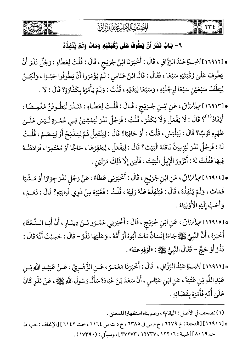 16912- أخبرنا عبد الرزاق، قَالَ: أَخْبَرَنَا ابْنُ جُرَيْجٍ، قَالَ: قُلْتُ لِعَطَاءٍ: رَجُلٌ نَذَرَ أَنْ يَطُوفَ عَلَى رُكْبَتَيْهِ سَبْعًا، فَقَالَ: قَالَ ابْنُ عَبَّاسٍ: لَمْ يُؤْمَرُوا أَنْ يَطُوفُوا حَبْوًا، وَلَكِنْ لِيَطُفْ سَبْعَيْنِ، سَبْعًا لِرِجْلَيهِ، وَسَبْعًا لِيَدَيهِ، قُلْتُ: وَلَمْ يَأْمُرْهُ بِكَفَّارَةٍ؟ قَالَ: لاَ.