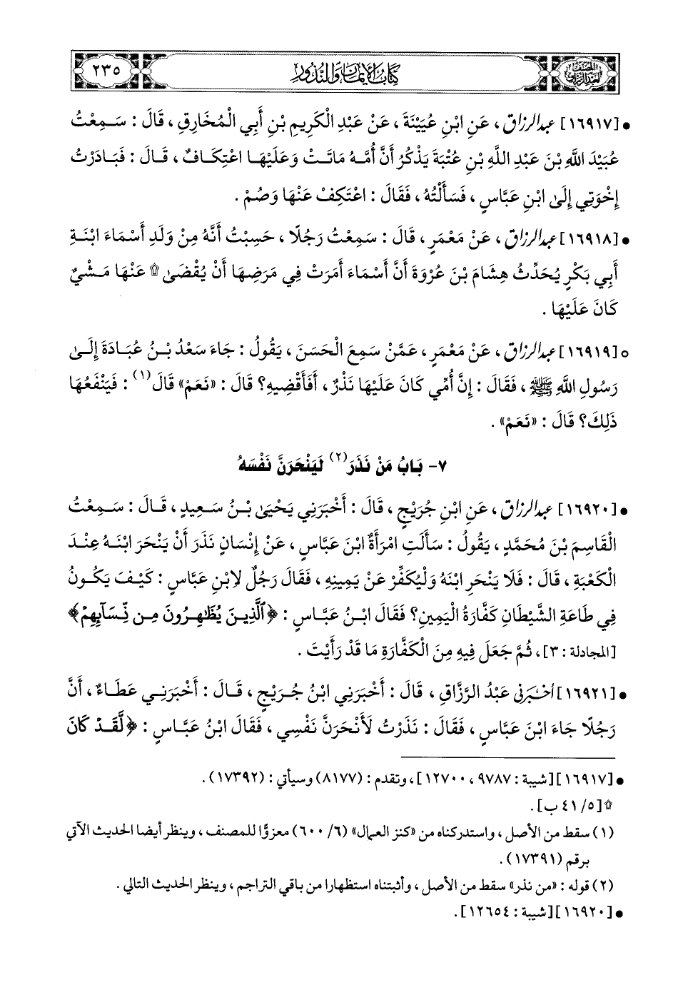 16920- عبد الرزاق، عَنِ ابْنِ جُرَيْجٍ، قَالَ: أَخْبَرَنِي يَحيَى بن سَعيدٍ، قَالَ: سَمِعْتُ الْقَاسِمَ بن مُحَمَّدٍ يَقُولُ: سَأَلَتِ امْرَأَةٌ ابْنَ عَبَّاسٍ عَن إِنْسَانٍ نَذَرَ أَنْ يَنْحَرَ ابْنَهُ عِنْدَ الْكَعْبَةِ، قَالَ: فَلاَ يَنْحَرِ ابْنَهُ، وَلْيُكَفِّرْ عَن يَمِينِهِ، فَقَالَ رَجُلٌ لاِبْنِ عَبَّاسٍ: كَيْفَ يَكُونُ فِي طَاعَةِ الشَّيْطَانِ كَفَّارَةُ الْيَمِينِ؟ فَقَالَ ابْنُ عَبَّاسٍ: {الَّذِينَ يُظَاهِرُونَ مِنْ نِسَائِهِمْ} ثُمَّ جَعَلَ فِيهِ مِنَ الْكَفَّارَةِ مَا قَدْ رَأَيْتَ.