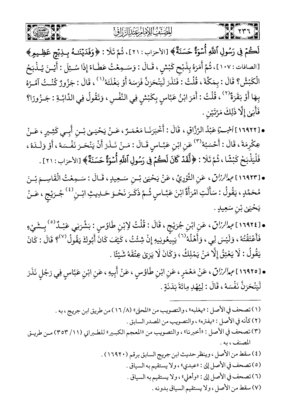 16922- أخبرنا عبد الرزاق، قَالَ: أَخْبَرَنَا مَعْمَرٌ، عَن يَحيَى بنِ أَبِي كَثِيرٍ، عَنْ عِكْرِمَةَ، قَالَ: أَحْسَبُهُ عَنِ ابْنِ عَبَّاسٍ، قَالَ: مَنْ نَذَرَ أَنْ يَنْحَرَ نَفْسَهُ، أَوْ وَلَدَهُ، فَلْيَذْبَحْ كَبْشًا، ثُمَّ تَلاَ: {لَقَدْ كَانَ لَكُمْ فِي رَسُولِ اللهِ أُسْوَةٌ حَسَنَةٌ}.