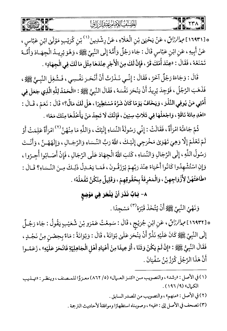 16932- عبد الرزاق، عَنِ ابْنِ جُرَيْجٍ، قَالَ: سَمِعْتُ عَمْرَو بن شُعَيْبٍ يَقُولُ: جَاءَ رَجُلٌ إِلَى النَّبِيِّ صَلَّى اللهُ عَلَيْهِ وَسَلَّمَ كَانَ عَلَيْهِ نَذْرٌ أَنْ يَنْحَرَ عَلَى بُوَانَةَ، قَالَ: وَبُوانَةٌ مَاءٌ بِحْصِنٍ مِنْ نَجْدٍ، فَقَالَ النَّبِيُّ صَلَّى اللهُ عَلَيْهِ وَسَلَّمَ: إِنْ لَمْ يَكُنْ وَثَنًا، أَوْ عِيدًا مِنْ أَعْيَادِ أَهْلِ الْجَاهِلِيَّةِ، فَانْحَرْ عَلَيْهِ، زَعَمُوا أَنَّ هَذَا الرَّجُلَ كُرْزُ بن سُفْيَانَ.