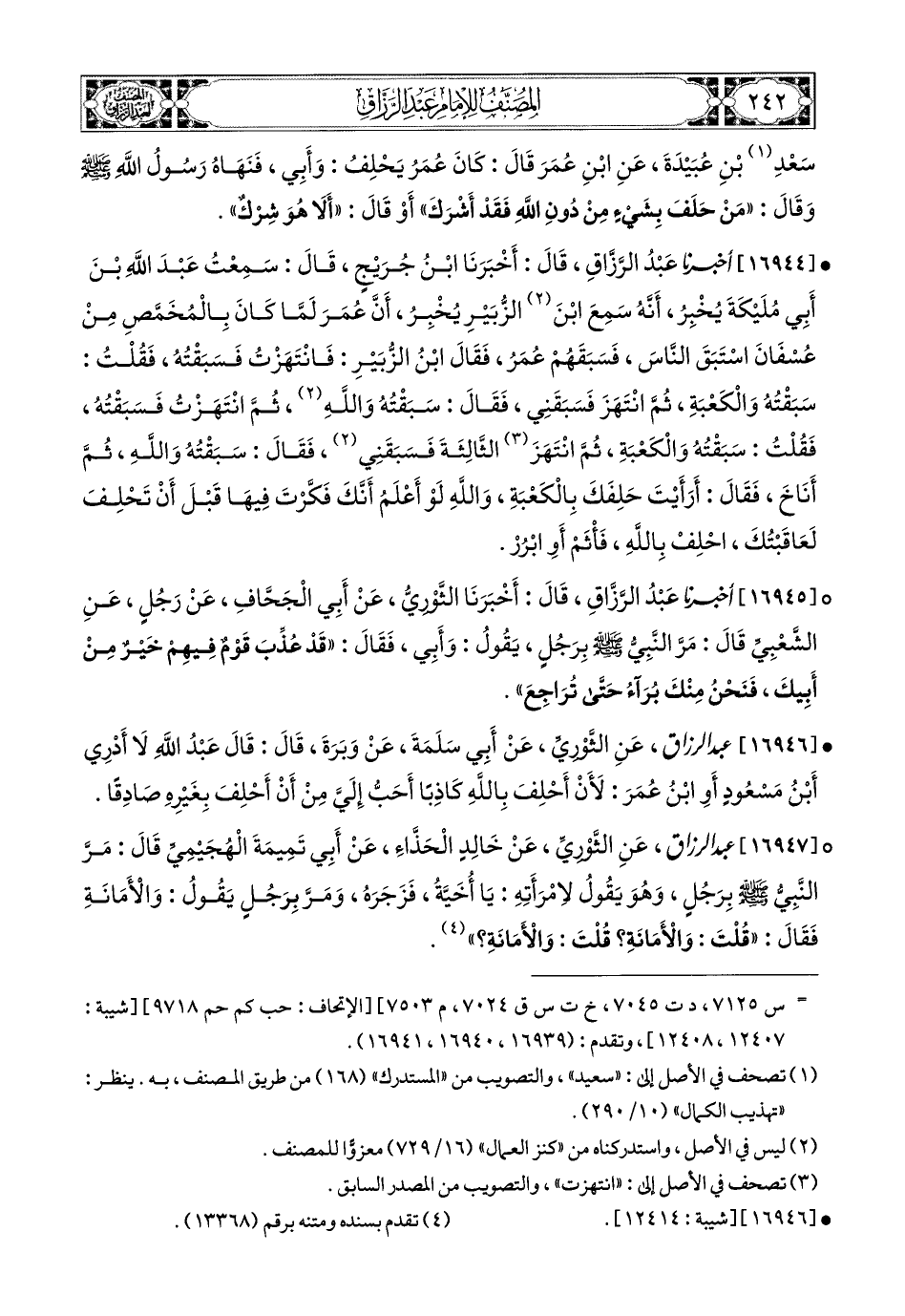 16945- أخبرنا عبد الرزاق، قَالَ: أَخْبَرَنَا الثَّورِيُّ، عَنْ أَبِي الْجَحَّافِ، عَن رَجُلٍ، عَنِ الشَّعْبِيِّ، قَالَ: مَرَّ النَّبِيُّ صَلَّى اللهُ عَلَيْهِ وَسَلَّمَ بِرَجُلٍ يَقُولُ: وَأَبِي، فَقَالَ: قَدْ عُذِّبَ قَوْمٌ فِيهِمْ خَيْرٌ مِنْ أَبِيكَ، فَنَحْنُ مِنْكَ بُرَآءُ حَتَّى تُرَاجِعَ.
