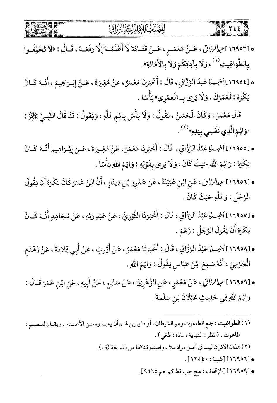 16953- عبد الرزاق، عَنْ مَعْمَرٍ، عَن قَتَادَةَ، لاَ أَعْلَمُهُ إِلاَّ رَفَعَهُ، قَالَ: لاَ تَحْلِفُوا بِالطَّوَاغِيتِ وَلاَ بِآبَائِكُمْ، وَلاَ بِالأَمَانَةِ.
