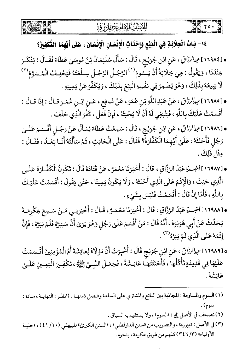 16984- عبد الرزاق، عَنِ ابْنِ جُرَيْجٍ، قَالَ: سَأَلَ سُلَيْمَانُ بن مُوسَى عَطَاءً فَقَالَ: يُنْكَرُ عِنْدَنَا، وَيَقُولُ: هِيَ خِلاَبَةٌ أَنْ يَسُومَ الرَّجُلُ الرَّجُلَ سِلْعَتَهُ، فَيَحْلِفُ المُسَوَّمُ لاَ يَبِيعُهُ بِذَلِكَ، وَهُوَ يُضْمِرُ فِي نَفْسِهِ الْبَيْعَ بِذَلِكَ، وَيُكَفِّرَ عَن يَمِينِهِ.