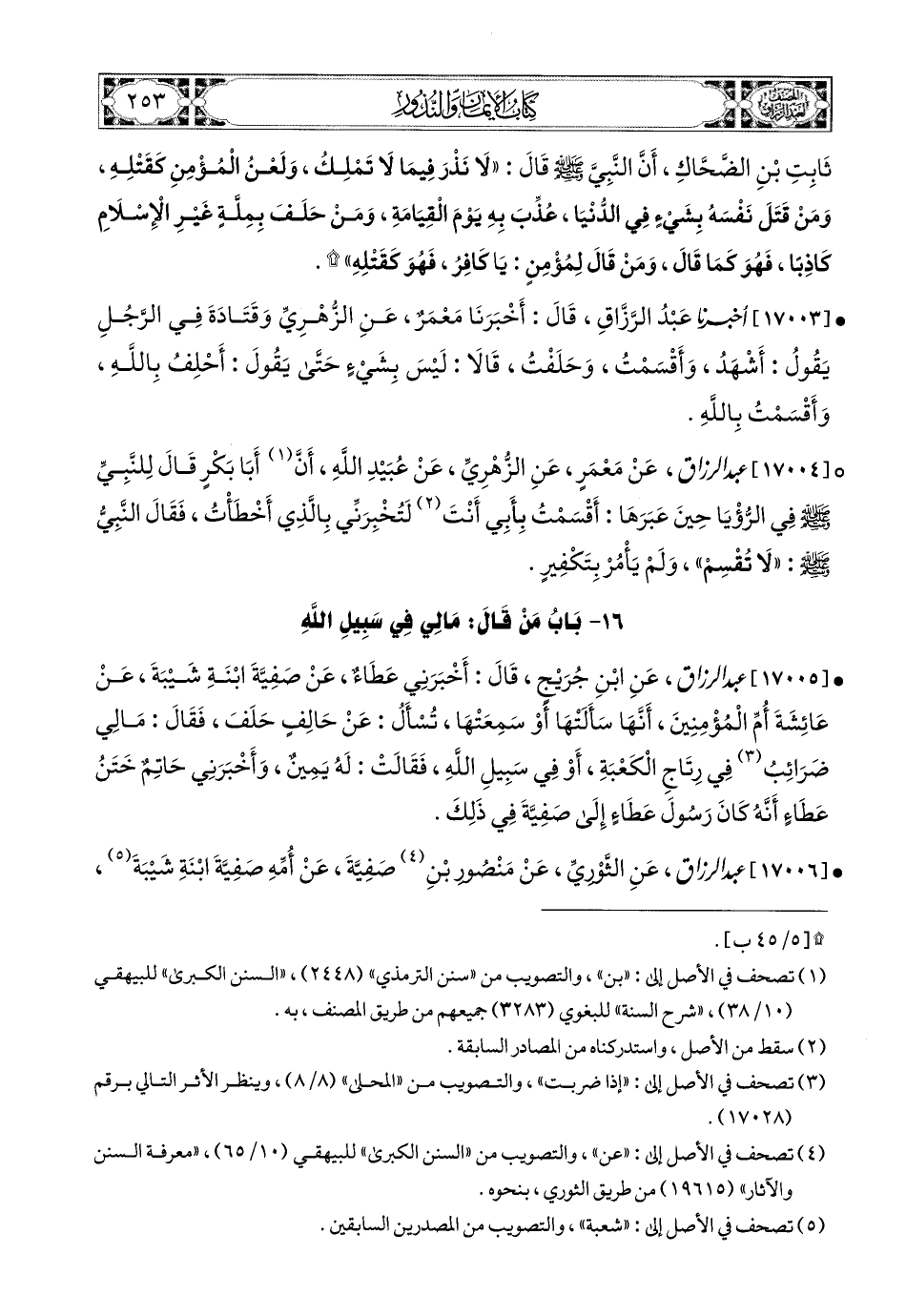 17004- عبد الرزاق، عَنْ مَعْمَرٍ، عَنِ الزُّهْرِيِّ، عَن عُبَيْدِ اللهِ، أَنَّ أَبَا بَكْرٍ قَالَ لِلنَّبِيِّ صَلَّى اللهُ عَلَيْهِ وَسَلَّمَ فِي الرُّؤْيَا حِينَ عَبَرَهَا: أَقْسَمْتُ بِأَبِي أَنْتَ لَتُخْبِرَنِّي بِالَّذِي أَخْطَأْتُ، فَقَالَ النَّبِيُّ صَلَّى اللهُ عَلَيْهِ وَسَلَّمَ: لاَ تُقْسِمْ، وَلَمْ يَأْمُرْ بِتَكْفِيرٍ.