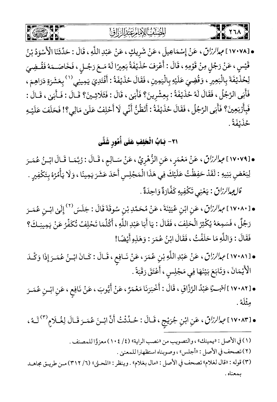 17079- عبد الرزاق، عَنْ مَعْمَرٍ، عَنِ الزُّهْرِيِّ، عَن سَالِمٍ قَالَ: رُبَّمَا قَالَ ابْنُ عُمَرَ لِبَعْضِ بَنِيهِ: لَقَدْ حَفِظْتُ عَلَيْكَ فِي هَذَا المَجْلِسِ أَحَدَ عَشَرَ يَمِينًا، وَلاَ يَأْمُرُهُ بِتَكْفِيرٍ.