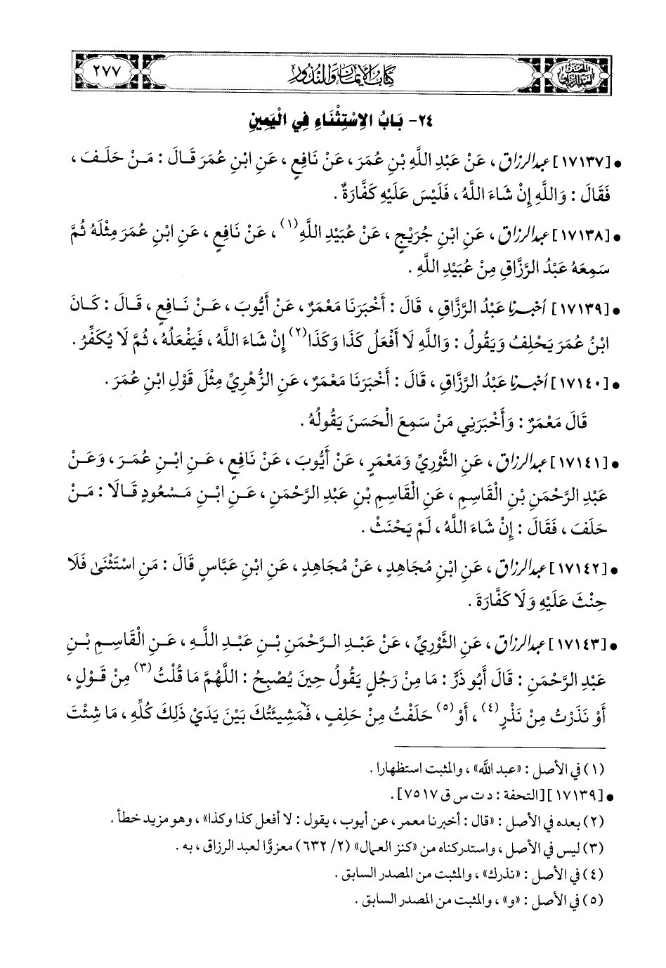 17137- عبد الرزاق، عَنْ عَبدِ اللهِ بْنِ عُمَرَ، عَن نَافِعٍ، عَنِ ابْنِ عُمَرَ، قَالَ: مَنْ حَلَفَ فَقَالَ: وَاللهِ إِنْ شَاءَ اللهُ، فَلَيْسَ عَلَيْهِ كَفَّارَةٌ.