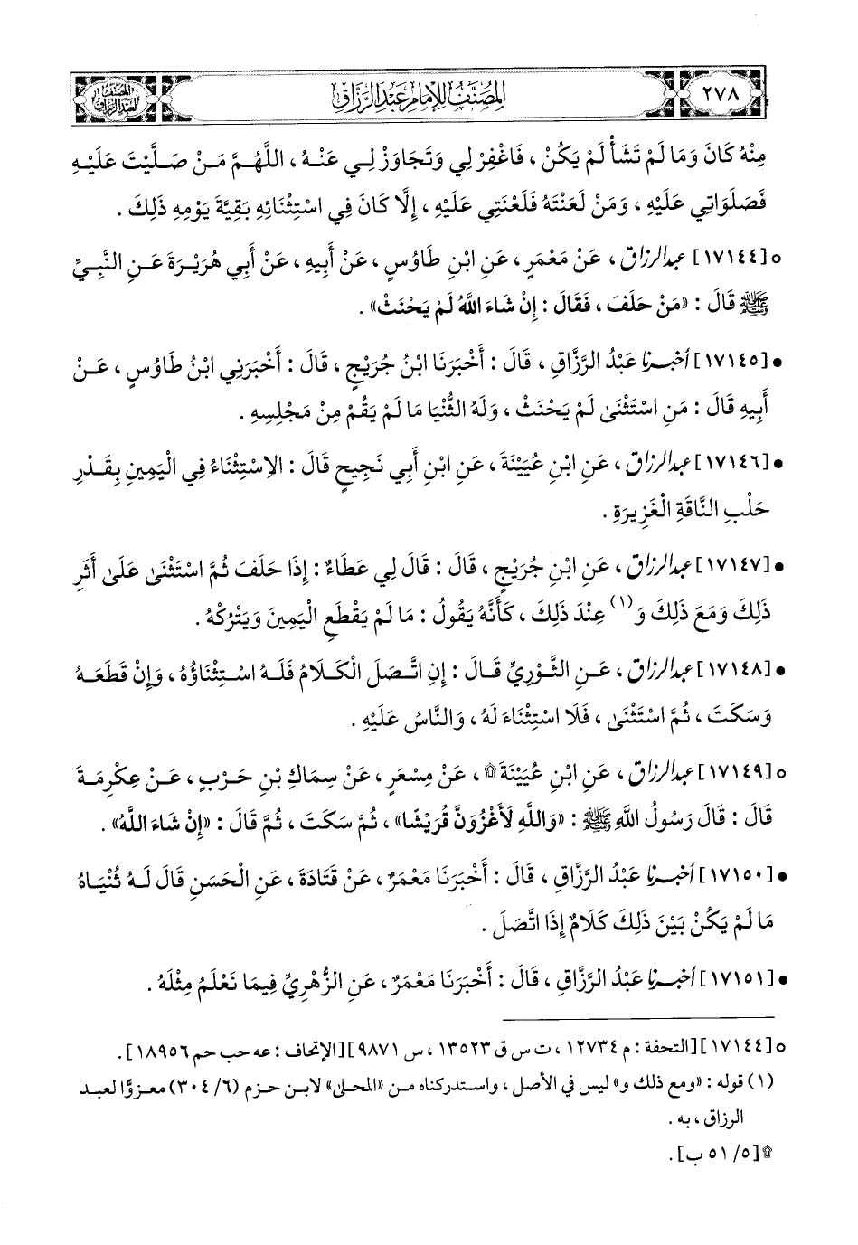 17144- عبد الرزاق، عَنْ مَعْمَرٍ، عَنِ ابْنِ طَاوُوسٍ، عَنْ أَبِيهِ، عَنْ أَبِي هُرَيرَةَ، عَنِ النَّبِيِّ صَلَّى اللهُ عَلَيْهِ وَسَلَّمَ قَالَ: مَنْ حَلَفَ فَقَالَ: إِنْ شَاءَ اللهُ لَمْ يَحْنَثْ.