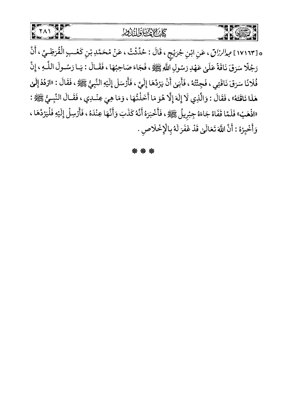17163- عبد الرزاق، عَنِ ابْنِ جُرَيْجٍ، قَالَ: حُدِّثْتُ عَن مُحَمَّدِ بْنِ كَعْبٍ الْقُرَظِيِّ، أَنَّ رَجُلاً سَرَقَ نَاقَةً عَلَى عَهْدِ رَسُولِ اللهِ صَلَّى اللهُ عَلَيْهِ وَسَلَّمَ، فَجَاءَ صَاحِبُهَا، فَقَالَ: يَا رَسُولَ اللهِ، إِنَّ فُلاَنًا سَرَقَ نَاقَتِي، فَجِئْتُهُ، فَأَبَى أَنْ يَرُدَّهَا إِلَيَّ، فَأَرْسَلَ إِلَيْهِ النَّبِيُّ صَلَّى اللهُ عَلَيْهِ وَسَلَّمَ، فَقَالَ: ارْدُدْ إِلَى هَذَا نَاقَتُهُ، فَقَالَ: وَالَّذِي لاَ إِلَهَ إِلاَّ هُوَ مَا أَخَذْتُهَا، وَمَا هِيَ عِنْدِي، فَقَالَ النَّبِيُّ صَلَّى اللهُ عَلَيْهِ وَسَلَّمَ: اذْهَبْ، فَلَمَّا قَفَاهُ جَاءَهُ جِبْرِيلُ صَلَّى اللهُ عَلَيْهِ وَسَلَّمَ، فَأَخْبَرَهُ أَنَّهُ كَذَبَ، وَأَنَّهَا عِنْدَهُ، فَأَرْسَلَ إِلَيْهِ فَلْيَرُدَّهَا، وَأَخْبَرَهُ أَنَّ اللهَ تَعَالَى قَدْ غَفَرَ لَهُ بِالإِخْلاَصِ.