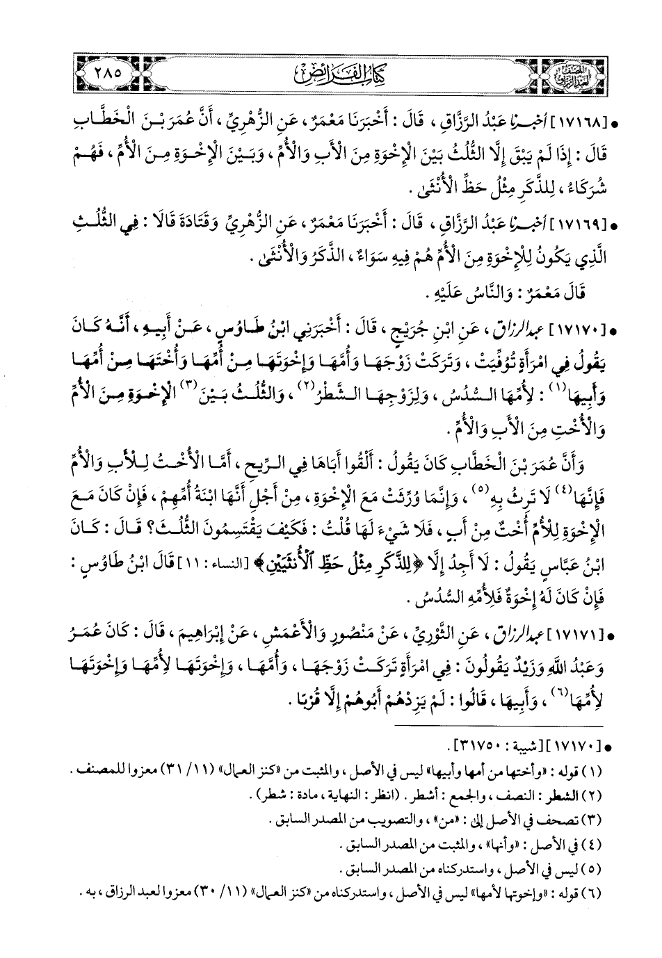17170 - عبد الرزاق، عَنِ ابْنِ جُرَيْجٍ، قَالَ: أَخْبَرَنِي ابْنُ طَاوُوسٍ، عَنْ أَبِيهِ، أَنَّهُ كَانَ يَقُولُ فِي امْرَأَةٍ تُوُفِّيَتْ، وَتَرَكَتْ زَوْجَهَا وَأُمَّهَا، وَإِخْوَتَهَا مِنْ أُمِّهَا، وَأُخْتَهَا مِنْ أُمِّهَا وَأَبِيهَا: لأُمِّهَا السُّدُسُ، وَلِزَوْجِهَا الشَّطْرُ، وَالثُّلُثُ بَيْنَ الإِخْوَةِ مِنَ الأُمِّ وَالأُخْتِ مِنَ الأَبِ وَالأُمِّ، وَأَنَّ عُمَرَ بن الْخَطَّابِ كَانَ يَقُولُ: أَلْقُوا أَبَاهَا فِي الرِّيحِ، أَمَّا الأُخْتُ لِلأَبِ وَالأُمِّ، فَإِنَّهَا لاَ تَرِثُ بِهِ، وَإِنَّمَا وَرِثَتْ مَعَ الإِخْوَةِ، مِنْ أَجْلِ أَنَّهَا ابْنَةُ أُمِّهِمْ، فَإِنْ كَانَ مَعَ الإِخْوَةِ لِلأُمِّ أُخْتٌ مِنْ أَبٍ (1)، فَلاَ شَيْءَ لَهَا، قُلْتُ: فَكَيْفَ يَقْتَسِمُونَ الثُّلُثَ؟ قَالَ: كَانَ ابْنُ عَبَّاسٍ يَقُولُ: لاَ أَجِدُ إِلاَّ لِلذَّكَرِ مِثْلُ حَظِّ الأُنْثَيَيْنِ، قَالَ ابْنُ طَاوُوسٍ: فَإِنْ كَانَ لَهُ إِخْوَةٌ فَلأُمِّهِ السُّدُسُ.