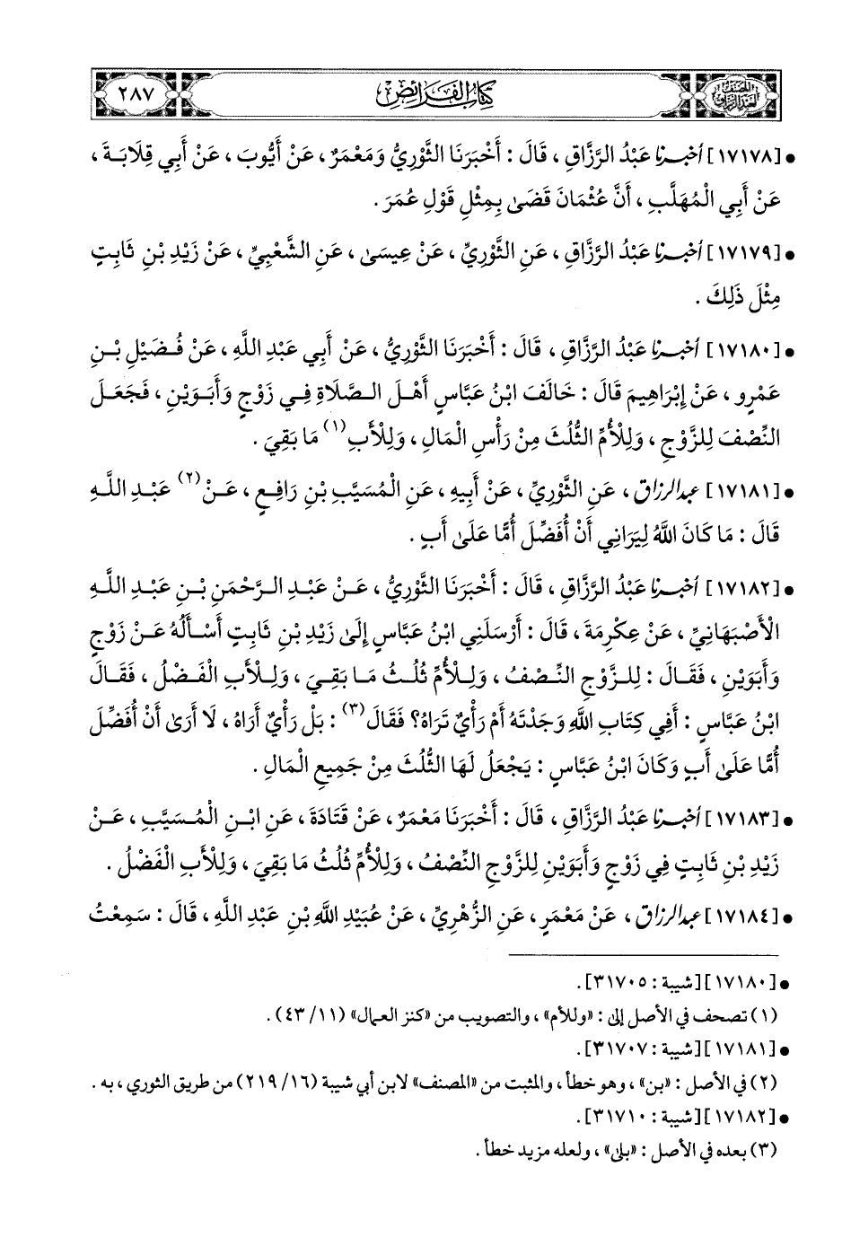 17179- أخبرنا عبد الرزاق، عَنِ الثَّورِيِّ، عَنْ عِيسَى، عَنِ الشَّعْبِيِّ، عَن زَيْدِ بْنِ ثَابِتٍ مِثْلَ ذَلِكَ.