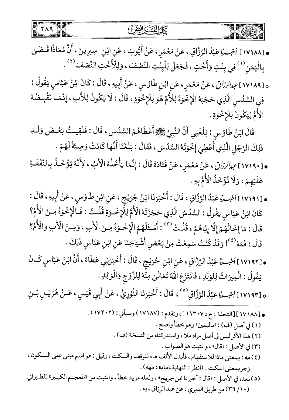 17189- عبد الرزاق، عَنْ مَعْمَرٍ، عَنِ ابْنِ طَاوُوسٍ، عَنْ أَبِيهِ، قَالَ: كَانَ ابْنُ عَبَّاسٍ يَقُولُ فِي السُّدُسِ الَّذِي حَجَبَهُ الإِخْوَةُ لِلأُمِّ هُوَ لِلإِخْوَةِ، قَالَ: لاَ يَكُونُ لِلأَبِ إِنَّمَا تَقْبِضُهُ الأُمُّ، لِيَكُونَ لِلإِخْوَةِ.