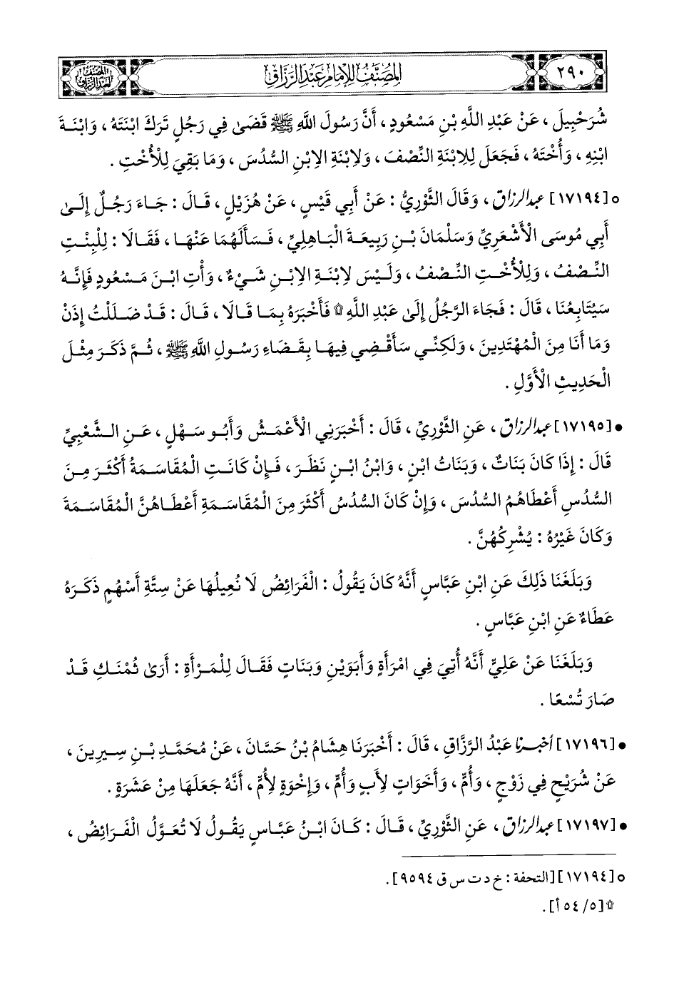 17195- عبد الرزاق، عَنِ الثَّورِيِّ، قَالَ: أَخْبَرَنِي الأَعمَشُ، وَأَبو سَهْلٍ، عَنِ الشَّعْبِيِّ، قَالَ: إِذَا كَانَ بَنَاتٌ وَبَنَاتُ ابْنٍ، وَابْنُ ابْنٍ نُظِرَ، فَإِنْ كَانَتِ المُقَاسَمَةُ أَكْثَرَ مِنَ السُّدُسِ، أَعْطَاهُمُ السُّدُسَ، وَإِنْ كَانَ السُّدُسُ أَكْثَرَ مِنَ المُقَاسَمَةِ أَعْطَاهُنَّ المُقَاسَمَةَ، وَكَانَ غَيْرُهُ يُشْرِكُهُنَّ، وَبَلَغَنَا ذَلِكَ عَنِ ابْنِ عَبَّاسٍ، أَنَّهُ كَانَ يَقُولُ: الْفَرَائِضُ لاَ نُعِيلُهَا عَن سِتَّةِ أَسْهُمٍ.