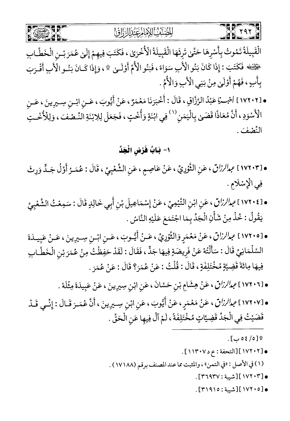 17205- عبد الرزاق، عَنْ مَعْمَرٍ، وَالثَّورِيِّ، عَنْ أَيُّوبَ، عَنِ ابْنِ سِيرِينَ، عَنْ عَبِيدَةَ السَّلْمَانِيِّ، قَالَ: سَأَلْتُهُ عَن فَرِيضَةٍ فِيهَا جَدٌّ، فَقَالَ: لَقَدْ حَفِظْتُ مِنْ عُمَرَ بْنِ الْخَطَّابِ فِيهَا مِئَةُ قَضِيَّةٍ مُخْتَلِفَةٍ، قَالَ: قُلْتُ: عَن عُمَرَ؟ قَالَ: عَن عُمَرَ.