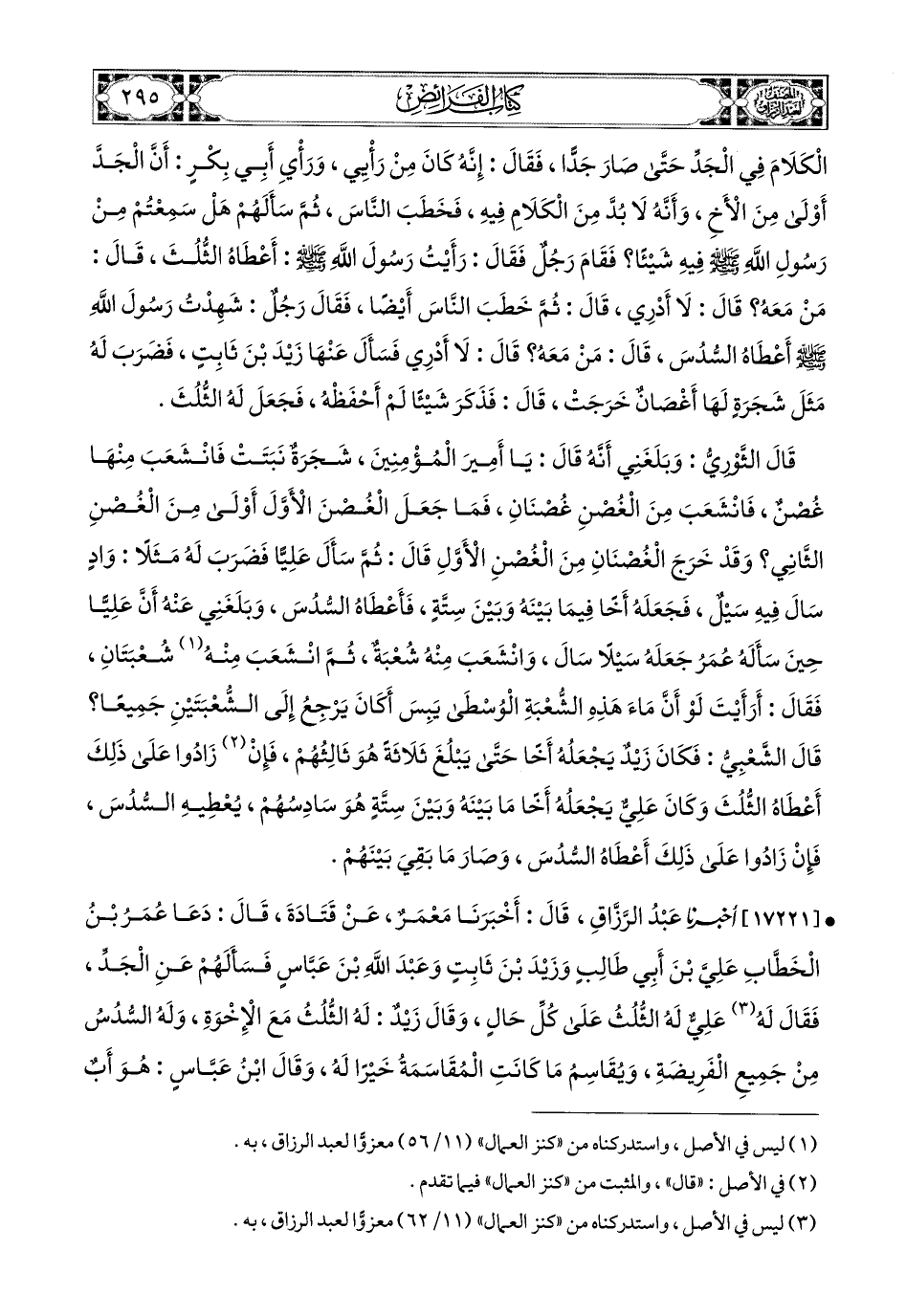 17221- أخبرنا عبد الرزاق، قَالَ: أَخْبَرَنَا مَعْمَرٌ، عَن قَتَادَةَ، قَالَ: دَعَا عُمَرُ بن الْخَطَّابِ عَلِيَّ بن أَبِي طَالِبٍ، وَزَيْدَ بن ثَابِتٍ، وَعَبْدَ اللهِ بن عَبَّاسٍ، فَسَأَلَهُمْ عَنِ الْجَدِّ، فَقَالَ لَهُ عَلِيٌّ: لَهُ الثُّلُثُ عَلَى كُلِّ حَالٍ، وَقَالَ زَيْدٌ: لَهُ الثُّلُثُ مَعَ الإِخْوَةِ، وَلَهُ السُّدُسُ مِنْ جَمِيعِ الْفَرِيضَةِ، وَيُقَاسِمُ مَا كَانَتِ المُقَاسَمَةُ خَيْرًا لَهُ، وَقَالَ ابْنُ عَبَّاسٍ: هُوَ أَبٌ، فَلَيْسَ لِلإِخْوَةِ مَعَهُ مِيرَاثٌ، وَقَدْ قَالَ اللهُ تَعَالَى: {مِلَّةَ أَبِيكُمْ إِبرَاهِيمَ} وَبَيْنَنَا وَبَيْنَهُ آبَاءٌ، قَالَ: فَأَخَذَ عُمَرُ بِقَوْلِ زَيْدٍ.