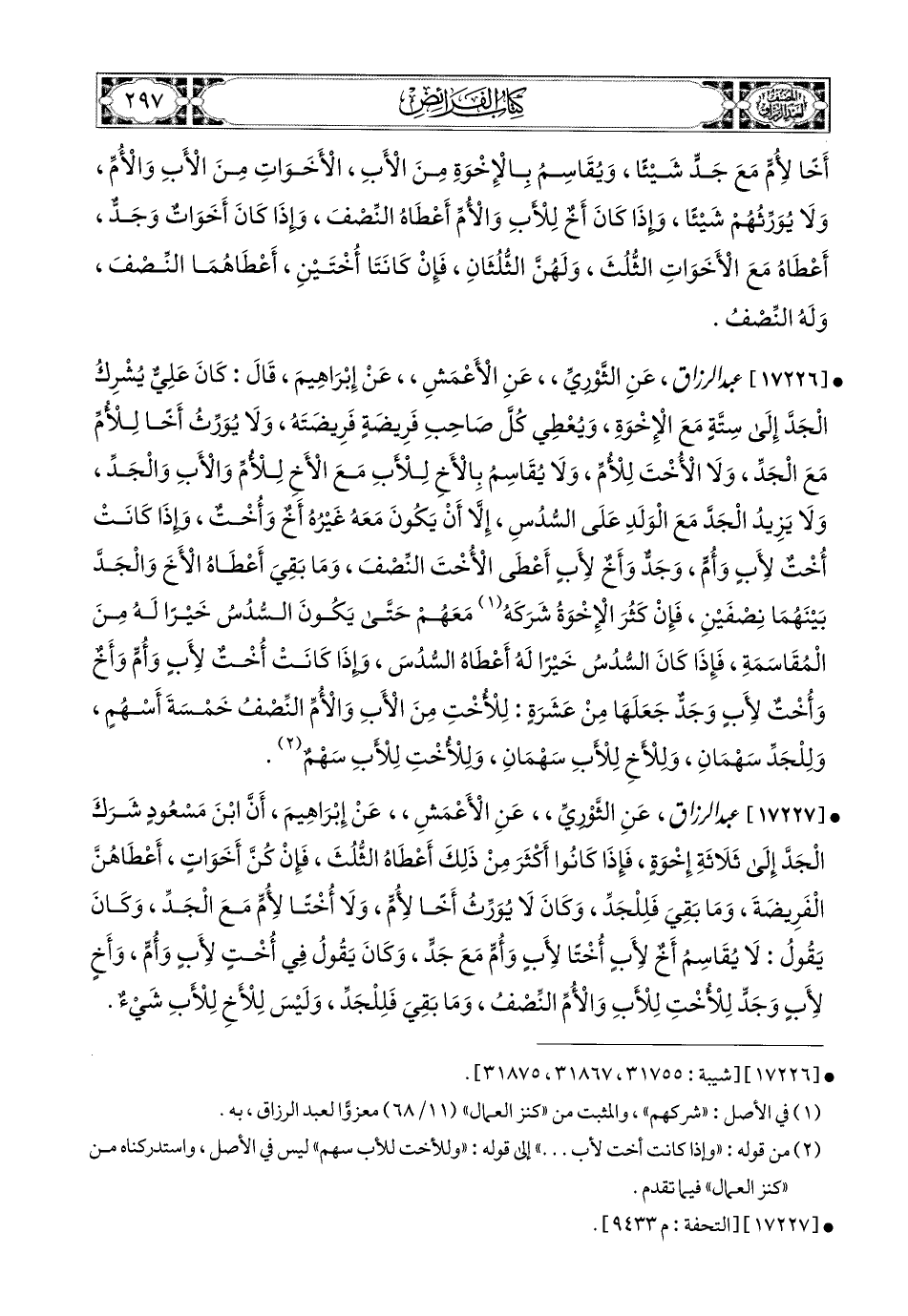 17227 - عبد الرزاق، عَنِ الثَّورِيِّ، عَنِ الأَعمَشِ، عَن إِبرَاهِيمَ، أَنَّ ابْنَ مَسْعُودٍ شَرَكَ الْجَدَّ إِلَى ثَلاَثَةِ إِخْوَةٍ، فَإِذَا كَانُوا أَكْثَرَ مِنْ ذَلِكَ، أَعْطَاهُ الثُّلُثَ، فَإِنْ كُنَّ أَخَوَاتٍ، أَعْطَاهُنَّ الْفَرِيضَةَ، وَمَا بَقِيَ فَلِلْجَدِّ، وَكَانَ لاَ يُوَرِّثُ أَخًا لأُمٍّ، وَلاَ أُخْتًا لأُمٍّ مَعَ الْجَدِّ، وَكَانَ يَقُولُ: لاَ يُقَاسِمُ أَخٌ لأَبٍ، أُخْتًا لأَبٍ وَأُمٍّ مَعَ جَدٍّ، وَكَانَ يَقُولُ فِي أُخْتٍ لأَبٍ وَأُمٍّ، وَأَخٍ لأَبٍ وَجَدٍّ: لِلأُخْتِ لِلأَبِ وَالأُمِّ النِّصْفُ، وَمَا بَقِيَ فَلِلْجَدِّ (1)، وَلَيْسَ لِلأَخِ لِلأَبِ شَيْءٌ.