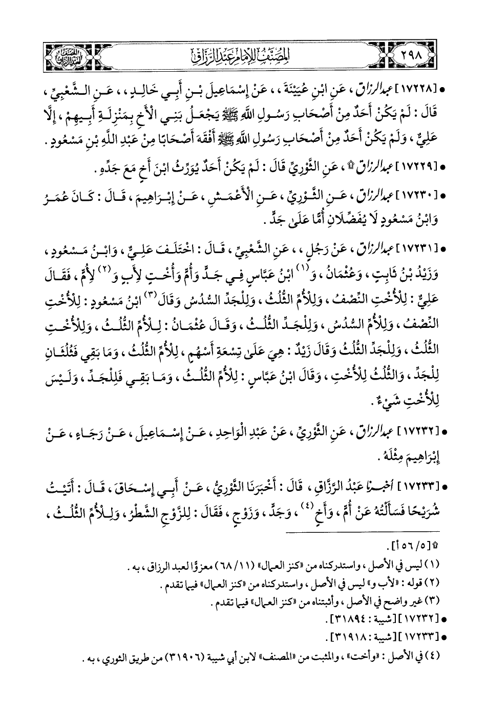 17228 - عبد الرزاق، عَنِ ابْنِ عُيَيْنَةَ، عَن إِسْمَاعِيلَ بْنِ أَبِي خَالِدٍ، عَنِ الشَّعْبِيِّ، قَالَ: لَمْ يَكُنْ أَحَدٌ مِنْ أَصْحَابِ رَسُولِ اللهِ صَلَّى اللهُ عَلَيْهِ وَسَلَّمَ يَجْعَلُ بَنِي الأَخِ بِمَنْزِلَةِ أَبِيهِمْ، إِلاَّ عَلِيٌّ، وَلَمْ يَكُنْ أَحَدٌ مِنْ أَصْحَابِ رَسُولِ اللهِ (1) صَلَّى اللهُ عَلَيْهِ وَسَلَّمَ أَفْقَهَ أَصْحَابًا مِنْ عَبدِ اللهِ بْنِ مَسْعُودٍ.