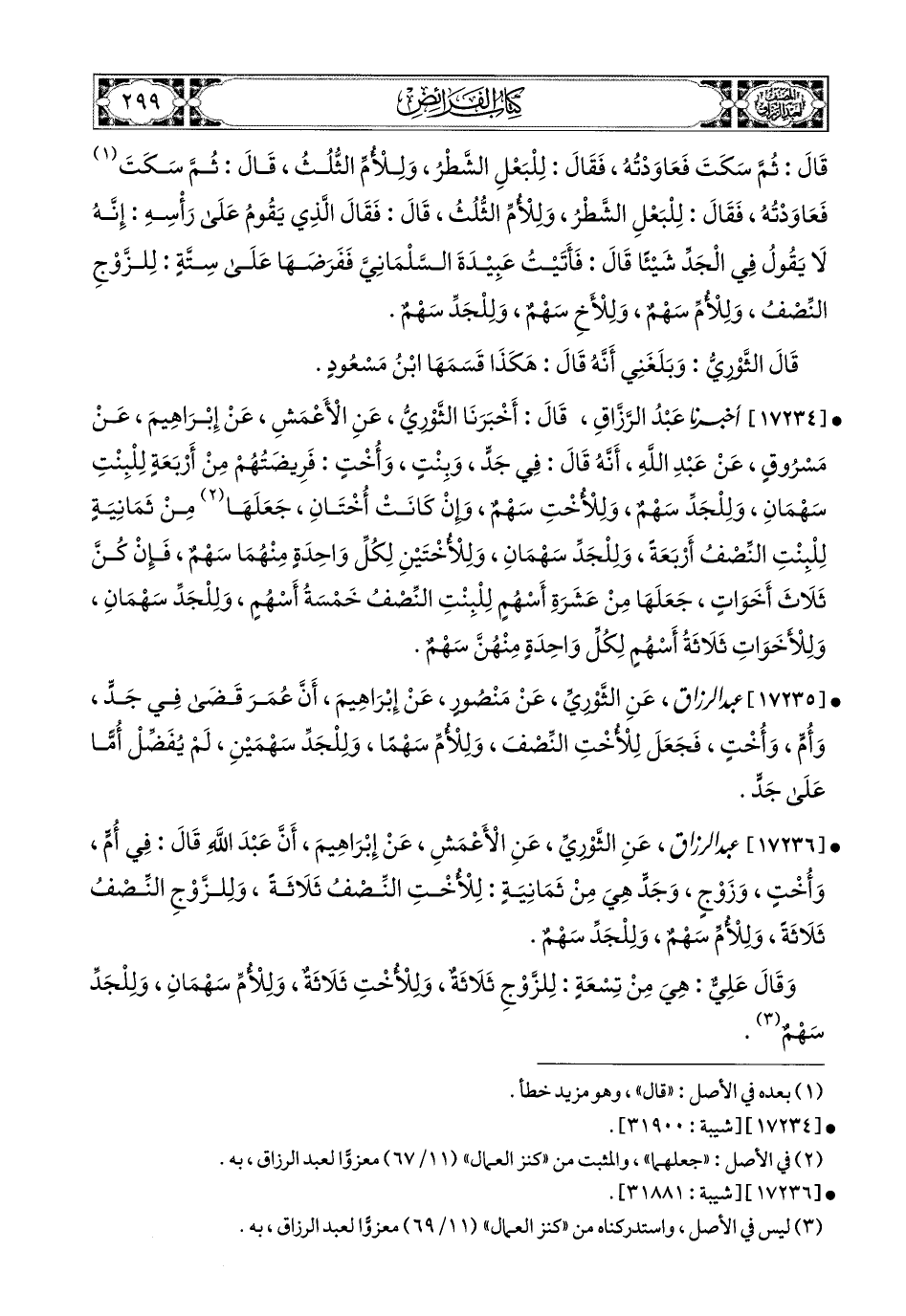 17234- أخبرنا عبد الرزاق، قَالَ: أَخْبَرَنَا الثَّورِيُّ، عَنِ الأَعمَشِ، عَن إِبرَاهِيمَ، عَنْ مَسْرُوقٍ، عَنْ عَبدِ اللهِ، أَنَّهُ قَالَ فِي جَدٍّ، وَبِنْتٍ، وَأُخْتٍ: فَرِيضَتُهُمْ مِنْ أَرْبَعَةٍ: لِلْبِنْتِ سَهْمَانِ، وَلِلْجَدِّ سَهْمٌ، وَلِلأُخْتِ سَهْمٌ، وَإِنْ كَانَتْ أُخْتَانِ، جَعَلَهَا مِنْ ثَمَانِيَةٍ: لِلْبِنْتِ النِّصْفُ أَرْبَعَةً، وَلِلْجَدِّ سَهْمَانِ، وَلِلأُخْتَيْنِ لِكُلِّ وَاحِدَةٍ مِنْهُمَا سَهْمٌ، فَإِنْ كُنَّ ثَلاَثَ أَخَوَاتٍ، جَعَلَهَا مِنْ عَشَرَةِ أَسْهُمٍ: لِلْبِنْتِ النِّصْفُ خَمْسَةُ أَسْهُمٍ، وَلِلْجَدِّ سَهْمَانِ، وَلِلأَخَواتِ ثَلاَثَةُ أَسْهُمٍ، لِكُلِّ وَاحِدَةٍ مِنْهُنَّ سَهْمٌ.