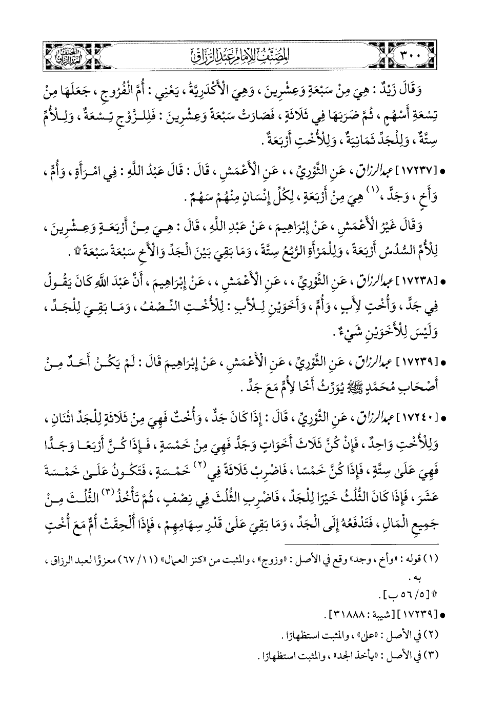 17237- عبد الرزاق، عَنِ الثَّورِيِّ، عَنِ الأَعمَشِ، قَالَ: قَالَ عَبدُ اللهِ فِي امْرَأَةٍ، وَأُمٍّ، وَأَخٍ، وَجَدٍ: هِيَ مِنْ أَرْبَعَةٍ، لِكُلِّ إِنْسَانٍ مِنْهُمْ سَهْمٌ، وَقَالَ غَيْرُ الأَعمَشِ، عَن إِبرَاهِيمَ، عَنْ عَبدِ اللهِ، قَالَ: هِيَ مِنْ أَرْبَعَةٍ وَعِشْرِينَ، لِلأُمِّ السُّدُسُ أَرْبَعَةً، وَللمَرْأةِ الرُّبُعُ سِتَّةً، وَمَا بَقِي بَيْنَ الْجَدِّ وَالأَخِ سَبْعَةً سَبْعَةً.