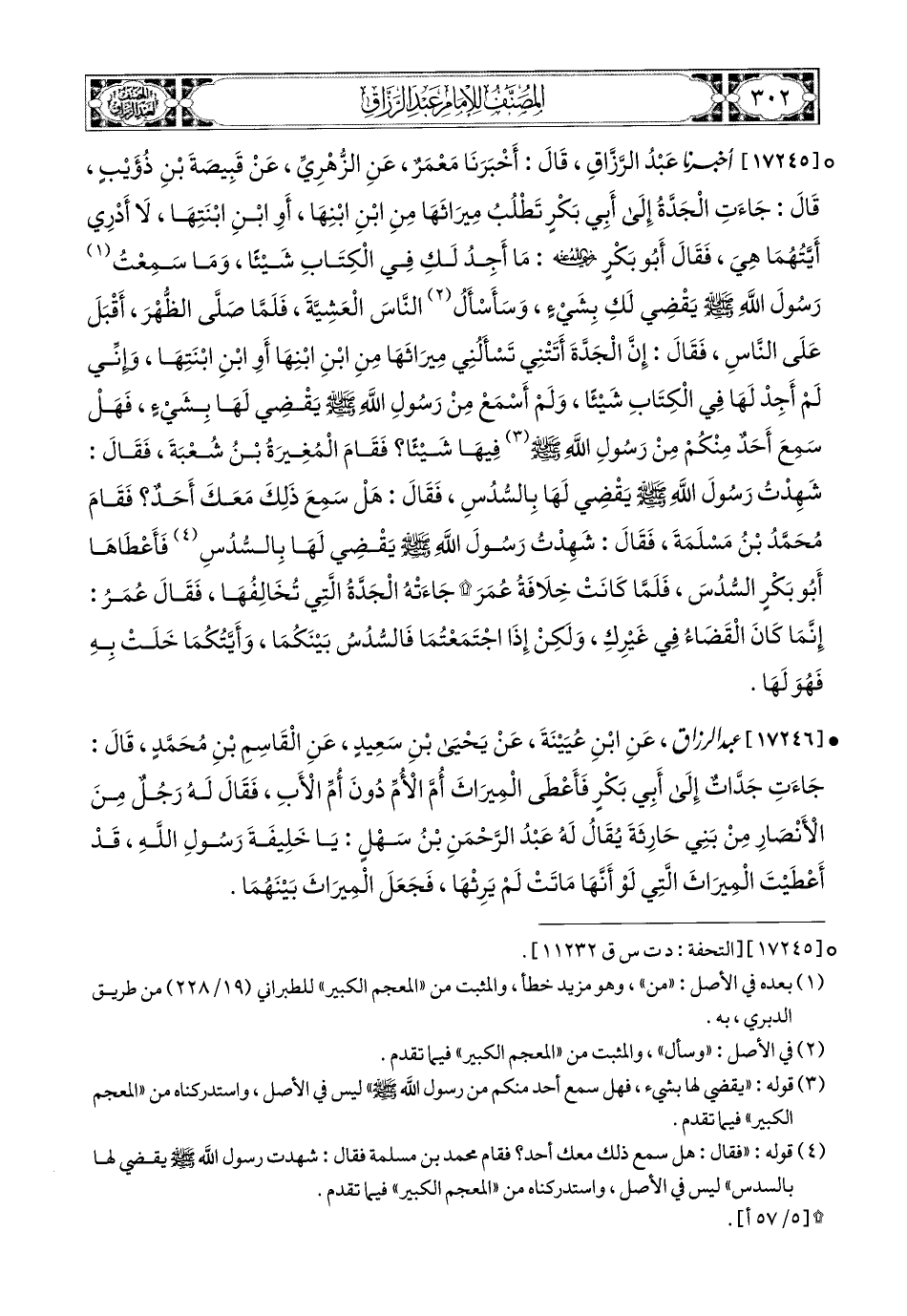 17245 - أخبرنا عبد الرزاق، قَالَ: أَخْبَرَنَا مَعْمَرٌ، عَنِ الزُّهْرِيِّ، عَن قَبِيصَةَ بْنِ ذُؤَيْبٍ، قَالَ: جَاءَتِ الْجَدَّةُ إِلَى أَبِي بَكْرٍ تَطْلُبُ مِيرَاثَهَا مِنِ ابْنِ ابْنِهَا، أَوِ ابْنِ ابْنَتِهَا، لاَ أَدْرِي أَيَّتُهُمَا هِيَ، فَقَالَ أَبو بَكْرٍ رضي الله عنه: ماَ (1) أَجِدُ لَكَ فِي الْكِتَابِ شَيْئًا، وَمَا سَمِعْتُ رَسُولَ اللهِ صَلَّى اللهُ عَلَيْهِ وَسَلَّمَ يَقْضِي لَكَ بِشَيْءٍ، وَسَأَسْأَلُ النَّاسَ الْعَشِيَّةَ، فَلَمَّا صَلَّى الظُّهْرَ، أَقْبَلَ عَلَى النَّاسِ، فَقَالَ: إِنَّ الْجَدَّةَ أَتَتْنِي تَسْأَلُنِي مِيرَاثَهَا مِنِ ابْنِ ابْنِهَا، أَوِ ابْنِ ابْنَتِهَا، وَإِنِّي لَمْ أَجِدْ لَهَا فِي الْكِتَابِ شَيْئًا، وَلَمْ أَسْمَعْ مِنْ رَسُولِ اللهِ صَلَّى اللهُ عَلَيْهِ وَسَلَّمَ يَقْضِي لَهَا بِشَيْءٍ، فَهَلْ سَمِعَ أَحَدٌ مِنْكُمْ مِنْ رَسُولِ اللهِ صَلَّى اللهُ عَلَيْهِ وَسَلَّمَ فِيهَا شَيْئًا؟ فَقَامَ المُغِيرَةُ بن شُعْبَةَ، فَقَالَ: شَهِدْتُ رَسُولَ اللهِ صَلَّى اللهُ عَلَيْهِ وَسَلَّمَ يَقْضِي لَهَا بِالسُّدُسِ، فَقَالَ: هَلْ سَمِعَ ذَلِكَ مَعَكَ أَحَدٌ؟ فَقَامَ مُحَمَّدُ بن مَسْلَمَةَ فَقَالَ: شَهِدْتُ رَسُولَ اللهِ صَلَّى اللهُ عَلَيْهِ وَسَلَّمَ يَقْضِي لَهَا بِالسُّدُسِ، فَأَعْطَاهَا أَبو بَكْرٍ السُّدُسَ، فَلَمَّا كَانَتْ خِلاَفَةُ عُمَرَ جَاءَتْهُ الْجَدَّةُ الَّتِي تُخَالِفُهَا، فَقَالَ عُمَرُ: إِنَّمَا كَانَ الْقَضَاءُ فِي غَيْرِكِ، وَلَكِنْ إِذَا اجْتَمَعْتُمَا (2) فَالسُّدُسُ بَيْنَكُمَا، وَأَيَّتُكُمَا خَلَتْ بِهِ فَهُوَ لَهَا.