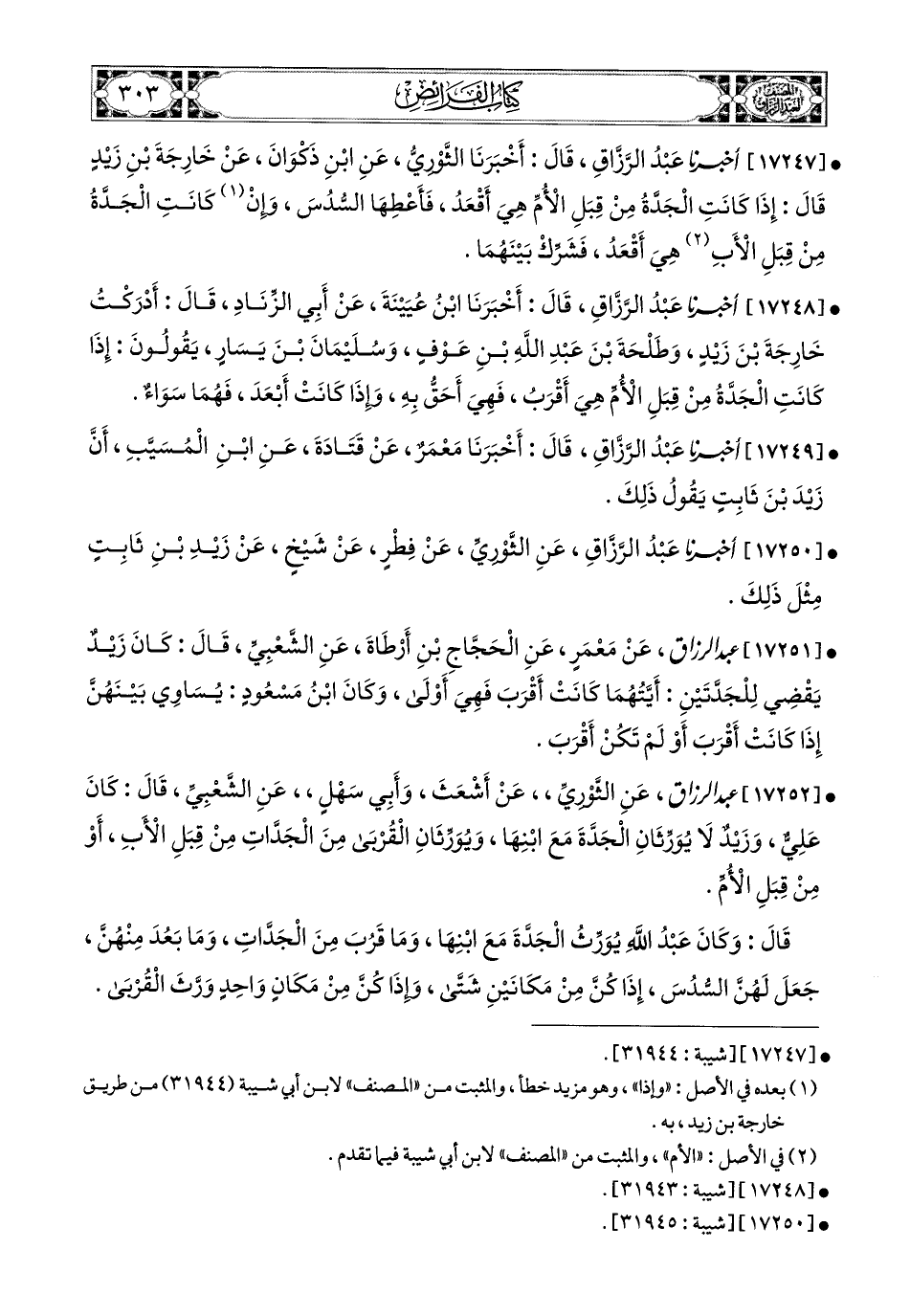 17251- عبد الرزاق، عَنْ مَعْمَرٍ، عَنِ الْحَجَّاجِ بْنِ أَرْطَاةَ، عَنِ الشَّعْبِيِّ، قَالَ: كَانَ زَيْدٌ يَقْضِي لِلْجَدَّتَيْنِ أَيَّتُهُمَا كَانَتْ أَقْرَبَ فَهِيَ أَوْلَى، وَكَانَ ابْنُ مَسْعُودٍ يُسَاوِي بَيْنَهُنَّ إِذَا كَانَتْ أَقْرَبَ، أَوْ لَمْ تَكُنْ أَقْرَبَ.