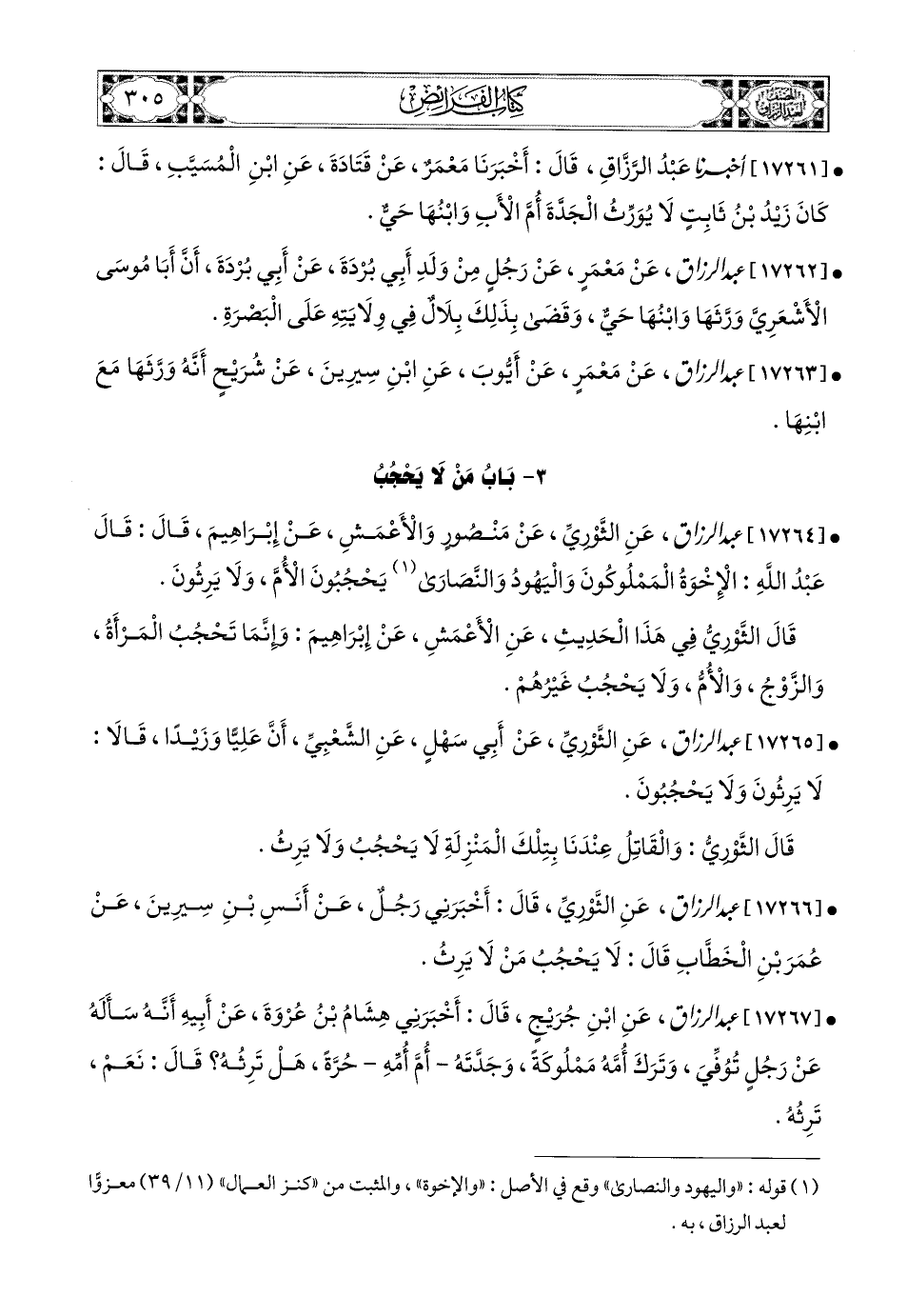 17264- عبد الرزاق، عَنِ الثَّورِيِّ، عَنْ مَنصُورٍ، وَالأَعمَشِ، عَن إِبرَاهِيمَ، قَالَ: قَالَ عَبدُ اللهِ: الإِخْوَةُ المَمْلُوكُونَ وَالْيَهُودُ وَالنَّصَارَى يَحْجُبُونَ الأُمَّ، وَلاَ يَرِثُونَ.