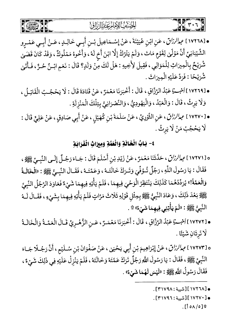 17271- عبد الرزاق، حَدَّثَنَا مَعْمَرٌ، عَن زَيْدِ بْنِ أَسْلَمَ، قَالَ: جَاءَ رَجُلٌ إِلَى النَّبِيِّ صَلَّى اللهُ عَلَيْهِ وَسَلَّمَ، فَقَالَ: يَا رَسُولَ اللهِ، رَجُلٌ تُوُفِّيَ وَتَرَكَ خَالَتَهُ، وَعَمَّتَهُ، فَقَالَ النَّبِيُّ صَلَّى اللهُ عَلَيْهِ وَسَلَّمَ: الْخَالَةُ وَالْعَمَّةُ يُرَدِّدُهُمَا، كَذَلِكَ يَنْتَظِرُ الْوَحْيَ فِيهِمَا، فَلَمْ يَأْتِهِ فِيهِمَا شَيْءٌ، فَعَاوَدَ الرَّجُلُ النَّبِيَّ صَلَّى اللهُ عَلَيْهِ وَسَلَّمَ بَعْدَ ذَلِكَ، وَعَادَ النَّبِيُّ صَلَّى اللهُ عَلَيْهِ وَسَلَّمَ بِمِثْلِ قَوْلِهِ ثَلاَثَ مَرَّاتٍ فَلَمْ يَأْتِهِ فِيهِمَا بِشَيْءٍ، فَقَالَ لَهُ النَّبِيُّ صَلَّى اللهُ عَلَيْهِ وَسَلَّمَ: لَمْ يَأْتِنِي فِيهِمَا شَيْءٌ.
