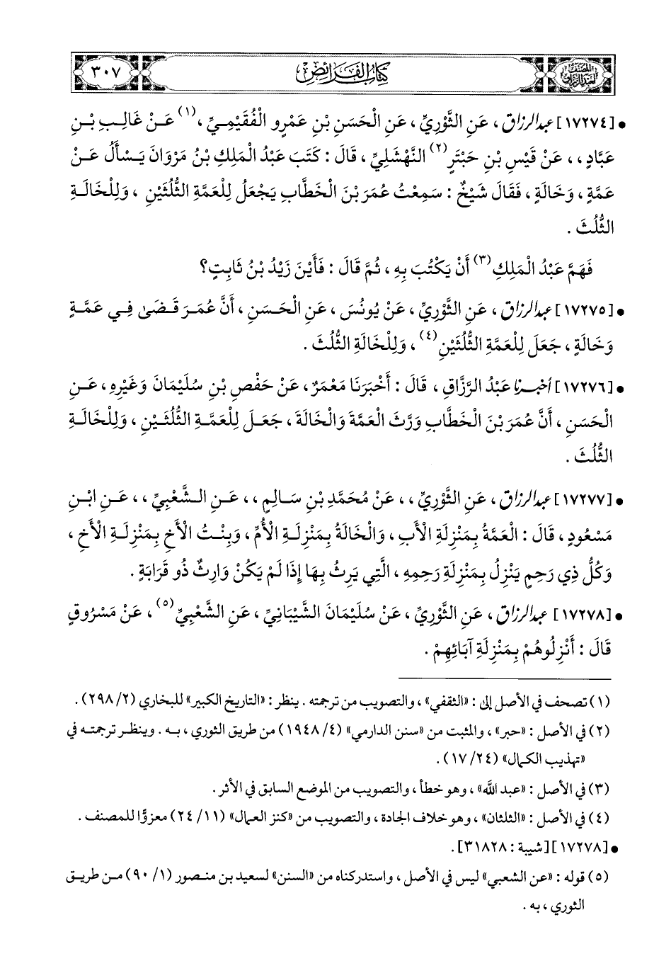 17274 - عبد الرزاق، عَنِ الثَّورِيِّ، عَنِ الْحَسَنِ بْنِ عَمْرٍو الْفُقَيْمِيِّ، عَن غَالِبِ بْنِ عَبَّادٍ، عَن قَيْسِ بْنِ حَبْتَرٍ النَّهْشَلِيِّ، قَالَ: كَتَبَ عَبدُ المَلِكِ بن مَرْوَانَ يَسْأَلُ عَنْ عَمَّةٍ، وَخَالَةٍ، فَقَالَ شَيْخٌ: سَمِعْتُ عُمَرَ بن الْخَطَّابِ يَجْعَلُ لِلْعَمَّةِ الثُّلُثَيْنِ، وَلِلْخَالَةِ الثُّلُثَ، فَهَمَّ عَبدُ المَلِكِ أَنْ يَكْتُبَ بِهِ (1)، ثُمَّ قَالَ: فَأَيْنَ زَيْدُ بن ثَابِتٍ.