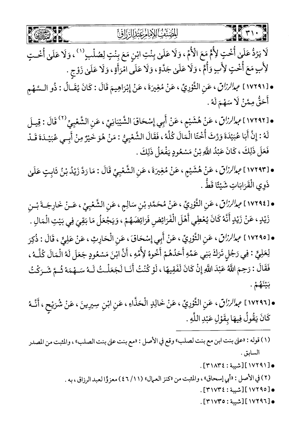 17292- عبد الرزاق، عَن هُشَيْمٍ، عَنْ أَبِي إِسْحَاقَ الشَّيْبَانِيِّ، عَنِ الشَّعْبِيِّ، قَالَ: قِيلَ لَهُ: إِنَّ أَبَا عُبَيْدَةَ وَرَّثَ أُخْتًا المَالَ كُلَّهُ، فَقَالَ الشَّعْبِيُّ: مَنْ هُوَ خَيْرٌ مِنْ أَبِي عُبَيْدَةَ قَدْ فَعَلَ ذَلِكَ؛ كَانَ عَبدُ اللهِ بن مَسْعُودٍ يَفْعَلُ ذَلِكَ.