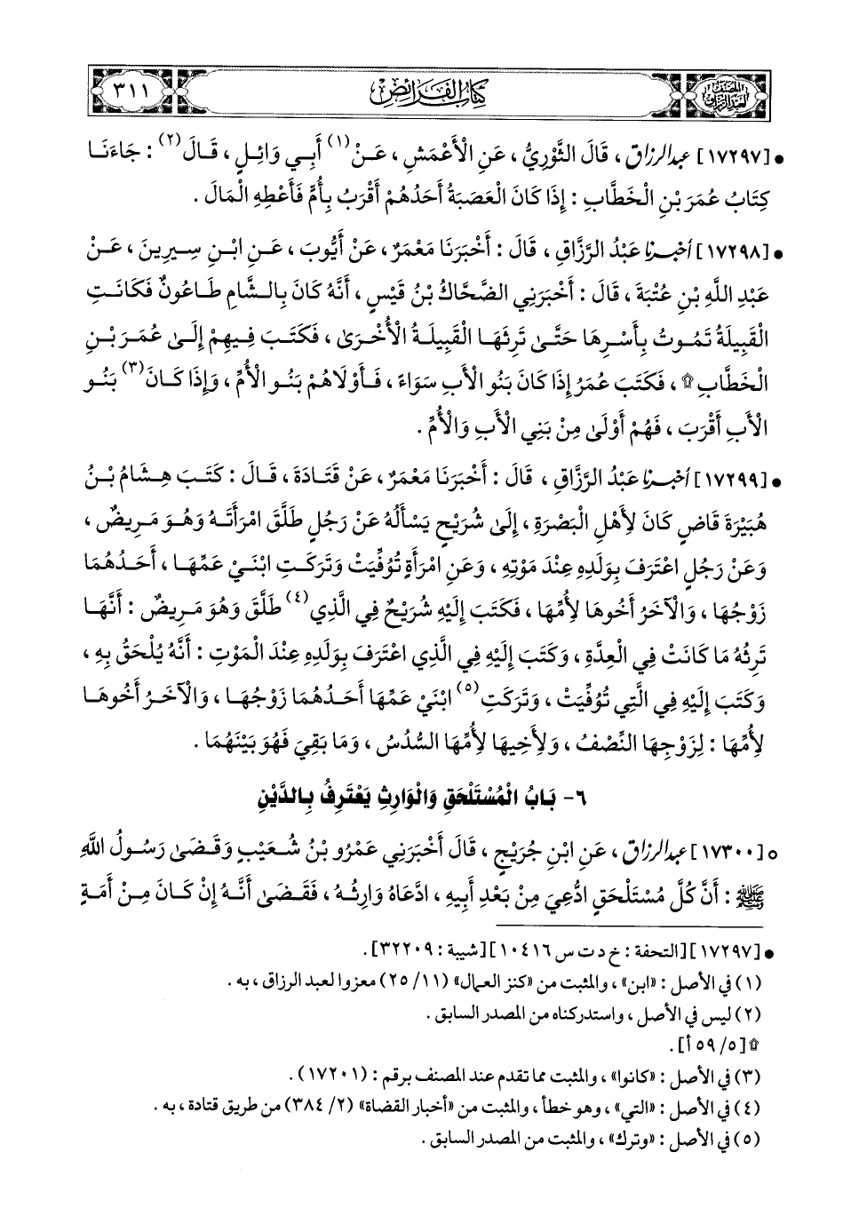 17300 - عبد الرزاق، عَنِ ابْنِ جُرَيْجٍ، قَالَ: أَخْبَرَنِي (1) عَمْرُو بن شُعَيْبٍ: وَقَضَى رَسُولُ اللهِ صَلَّى اللهُ عَلَيْهِ وَسَلَّمَ؛ أَنَّ كُلَّ مُسْتَلْحَقٍ ادُّعِيَ [مِنْ] (2) بَعْدِ أَبِيهِ ادَّعَاهُ وَارِثُهُ، فَقَضَى أَنَّهُ إِنْ كَانَ مِنْ أَمَةٍ أَصَابَهَا وَهُوَ يَمْلِكُهَا، فَقَدْ أَلْحَقَهَا مَنِ اسْتَلْحَقَهُ، وَلَيْسَ لَهُ مِنْ مِيرَاثِ أَبِيهِ الَّذِي يُدْعَى لَهُ شَيْءٌ، إِلاَّ أَنْ يُوَرِّثَهُ مَنِ اسْتَلْحَقَهُ فِي نَصِيبِهِ، وَأَنَّهُ مَا كَانَ مِنْ مِيرَاثٍ وَرِثُوهُ بَعْدَ أَنِ ادُّعِيَ، فَلَهُ نَصِيبُهُ مِنْهُ، وَقَضَى أَنَّهُ إِنْ كَانَ مِنْ أَمَةٍ لاَ يَمْلِكُهَا أَبوهُ فَالَّذِي يُدْعَى لَهُ، أَوْ مِنْ حُرَّةٍ عَهَرَ بِهَا، فَقَضَى أَنَّهُ لاَ يَلْحَقُ وَلاَ يَرِثُ، وَإِنْ كَانَ الَّذِي يُدْعَى لَهُ هُوَ [الذي] (2) ادَّعَاهُ، فَإِنَّهُ وَلَدُ زِنًا لأَهْلِ أُمِّهِ مَنْ كَانُوا حُرَّةً، أَوْ أَمَةً.