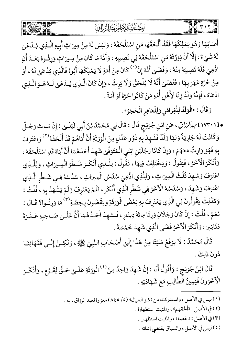 17301 - عبد الرزاق، عَنِ ابْنِ جُرَيْجٍ، قَالَ: قَالَ لِي مُحَمَّدُ بن أَبِي لَيْلَى: إِنْ مَاتَ رَجُلٌ، وَكَانَتْ لَهُ جَارِيَةٌ، وَلَهَا وَلَدٌ، فَشَهِدَ (1) بِهِ ذَوُو عَدْلٍ مِنَ الْوَرَثَةِ أَنَّ أَبَاهُمْ قَدْ أَلْحَقَهُ وَاعْتَرَفَ بِهِ، فَهُوَ وَارِثٌ مَعَهُمْ، وَإِنْ كَانَا رَجُلَيْنِ ابْنَيِ المُتَوَفَّى شَهِدَ أَحَدُهُمَا أَنَّ أَبَاهُ قَدِ اسْتَلْحَقَهُ، وَأَنْكَرَ الآخَرُ، فَيَقُولُ: وَيُخْتَلَفُ فِيهَا، نَقُولُ: لِلَّذِي أَنْكَرَ شَطْرُ المِيرَاثِ، وَلِلَّذِي اعْتَرَفَ وَشَهِدَ ثُلُثُ المِيرَاثِ، وَلِلَّذِي ادُّعِيَ سُدُسُ المِيرَاثِ، سُدُسُهُ فِي شَطْرِ الَّذِي اعْتَرَفَ وَشَهِدَ، وَسُدُسُهُ الآخَرُ فِي شَطْرِ الَّذِي أَنْكَرَ، فَلَمْ يَعْتَرِفْ، وَلَمْ يَشْهَدْ بِهِ، قُلْتُ: وَكَذَلِكَ يَقُولُونَ فِي الَّذِي يَعْتَرِفُ بِهِ بَعْضُ الْوَرَثَةِ، وَيَقْضُونَ بِحِصَّةِ مَا وَرِثُوا؟ قَالَ: نَعَمْ، قُلْتُ: إِنْ كَانَ رَجُلاَنِ وَرِثَا مِئَةَ دِينَارٍ، فَشَهِدَ أَحَدُهُمَا أَنَّ عَلَى صَاحِبِهِ عَشَرَةَ دَنَانِيرَ، وَأَنْكَرَ الآخَرُ، قَضَى الَّذِي شَهِدَ خَمْسَةً.