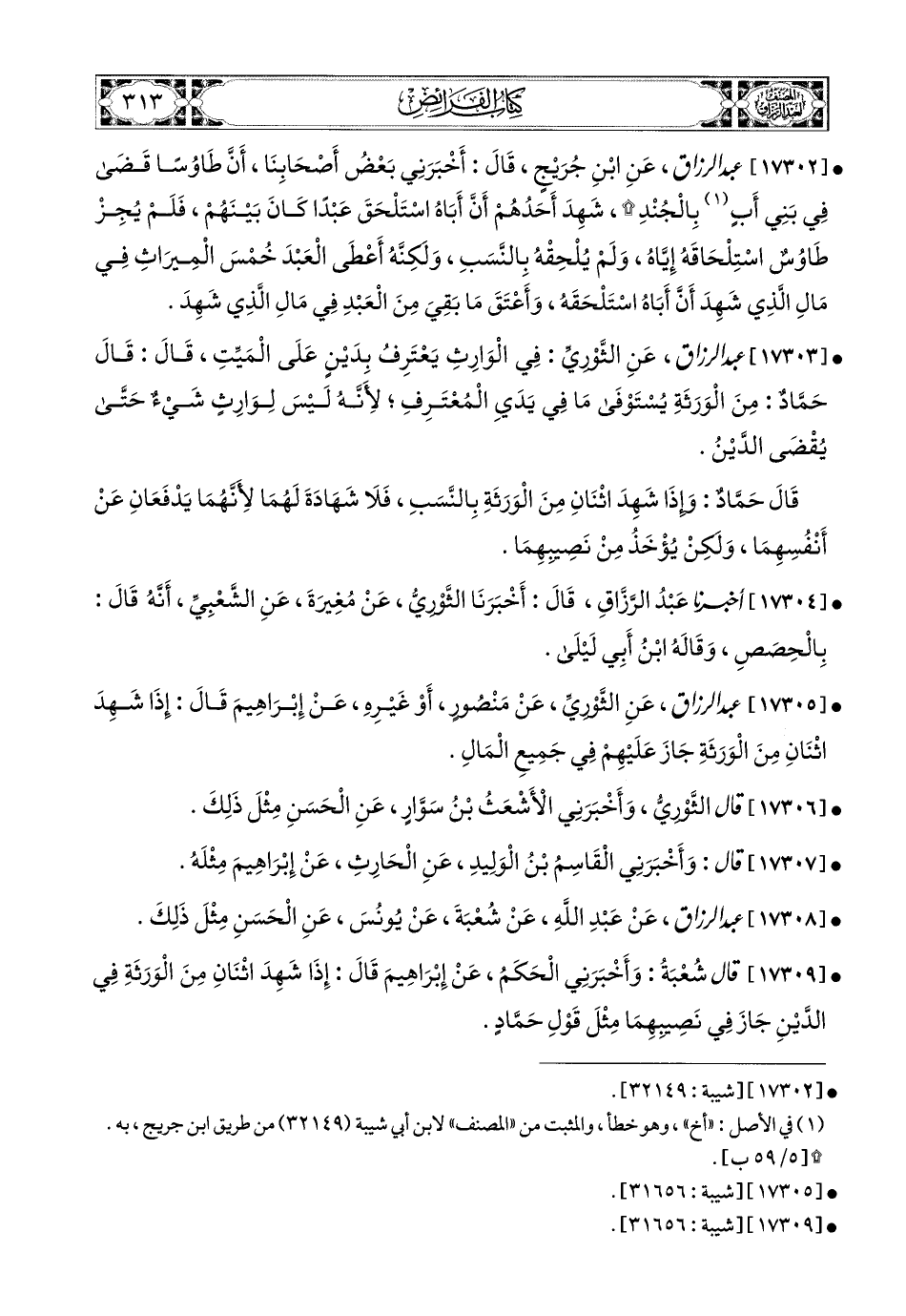 17305- عبد الرزاق، عَنِ الثَّورِيِّ، عَنْ مَنصُورٍ، أَوْ غَيْرِهِ، عَن إِبرَاهِيمَ، قَالَ: إِذَا شَهِدَ اثْنَانِ مِنَ الْوَرَثَةِ جَازَ عَلَيْهِمْ فِي جَمِيعِ المَالِ.