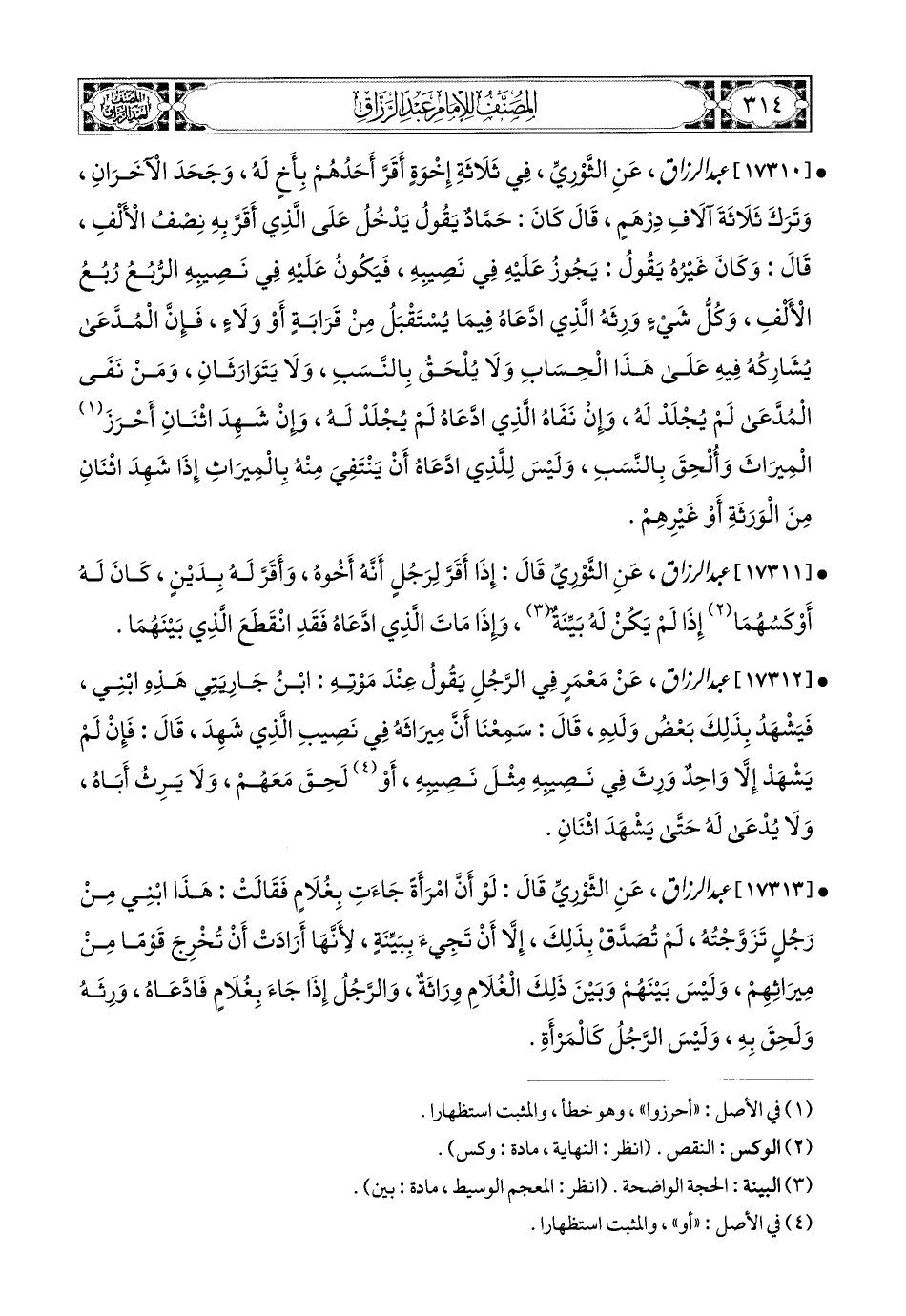 17310 - عبد الرزاق، عَنِ الثَّورِيِّ، فِي ثَلاَثَةِ إِخْوَةٍ، أَقَرَّ أَحَدُهُمْ بِأَخٍ لَهُ، وَجَحَدَ الآخَرَانِ، وَتَرَكَ ثَلاَثَةَ آلاَفِ دِرْهَمٍ، قَالَ: كَانَ حَمَّادٌ يَقُولُ: يَدْخُلُ عَلَى الَّذِي أَقَرَّ بِهِ نِصْفُ الأَلْفِ، قَالَ: وَكَانَ غَيْرُهُ يَقُولُ: يَجُوزُ عَلَيْهِ فِي نَصِيبِهِ، فَيَكُونُ عَلَيْهِ فِي نَصِيبِهِ الرُّبُعُ رُبْعُ الأَلْفِ، وَكُلُّ شَيْءٍ وَرِثَهُ الَّذِي ادَّعَاهُ فِيمَا يَسْتَقْبِلُ مِنْ قَرَابَةٍ، أَوْ وَلاَءٍ، فَإِنَّ المُدَّعَى يُشَارِكُهُ فِيهِ عَلَى هَذَا الْحِسَابِ، وَلاَ يَلْحَقُ بِالنَّسَبِ، وَلاَ يَتَوَارَثَانِ، وَمَنْ نَفَى المُدَّعَى لَمْ يُجْلَدْ لَهُ، وَإِنْ نَفَاهُ الَّذِي ادَّعَاهُ، لَمْ يُجْلَدْ [لَهُ] (1)، وَإِنْ شَهِدَ اثْنَانِ أُحْرِزَ المِيرَاثُ، وَألْحِقَ (2) بِالنَّسَبِ، وَلَيْسَ لِلَّذِي ادَّعَاهُ أَنْ يَنْتَفِيَ مِنْهُ بِالمِيرَاثِ إِذَا شَهِدَ اثْنَانِ مِنَ الْوَرَثَةِ، أَوْ غَيْرُهُمْ.