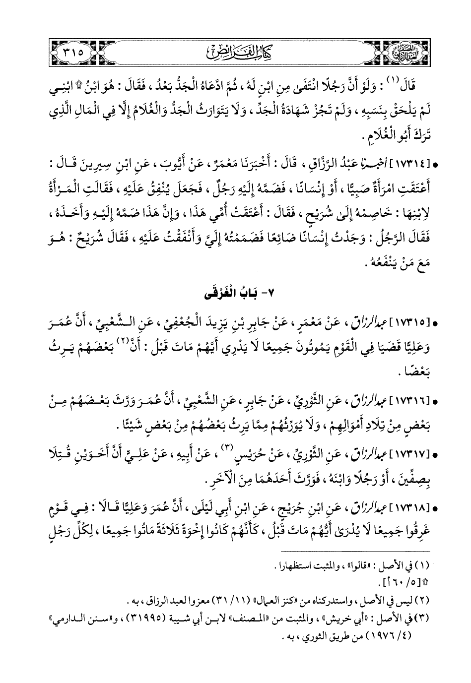 17318- عبد الرزاق، عَنِ ابْنِ جُرَيْجٍ، عَنِ ابْنِ أَبِي لَيْلَى، أَنَّ عُمَرَ، وَعَلِيًّا قَالاَ فِي قَوْمٍ غَرِقُوا جَمِيعًا لاَ يُدْرَى أَيُّهُمْ مَاتَ قَبْلُ، كَأَنَّهُمْ كَانُوا إِخْوَةً ثَلاَثَةً مَاتُوا جَمِيعًا، لِكُلِّ رَجُلٍ مِنْهُمْ أَلْفُ دِرْهَمٍ، وَأُمُّهُمْ حَيَّةٌ يَرِثُ هَذَا أُمَّهُ، وَأَخُوهُ، وَيَرِثُ هَذَا أُمَّهُ وَأَخُوهُ، فَيَكُونُ لِلأُمِّ مِنْ كُلِ رَجُلٍ مِنْهُمْ سُدُسُ مَا تَرَكَ، وَلِلإِخْوَةِ مَا بَقِيَ، كُلُّهُمْ كَذَلِكَ، ثُمَّ تَعُودُ الأُمُّ فَتَرِثُ سِوَى السُّدُسِ الَّذِي وَرِثَتْ أَوَّلَ مَرَّةٍ مِنْ كُلِّ رَجُلٍ مِمَّا وَرِثَ مِنْ أَخِيهِ الثُّلُثَ.