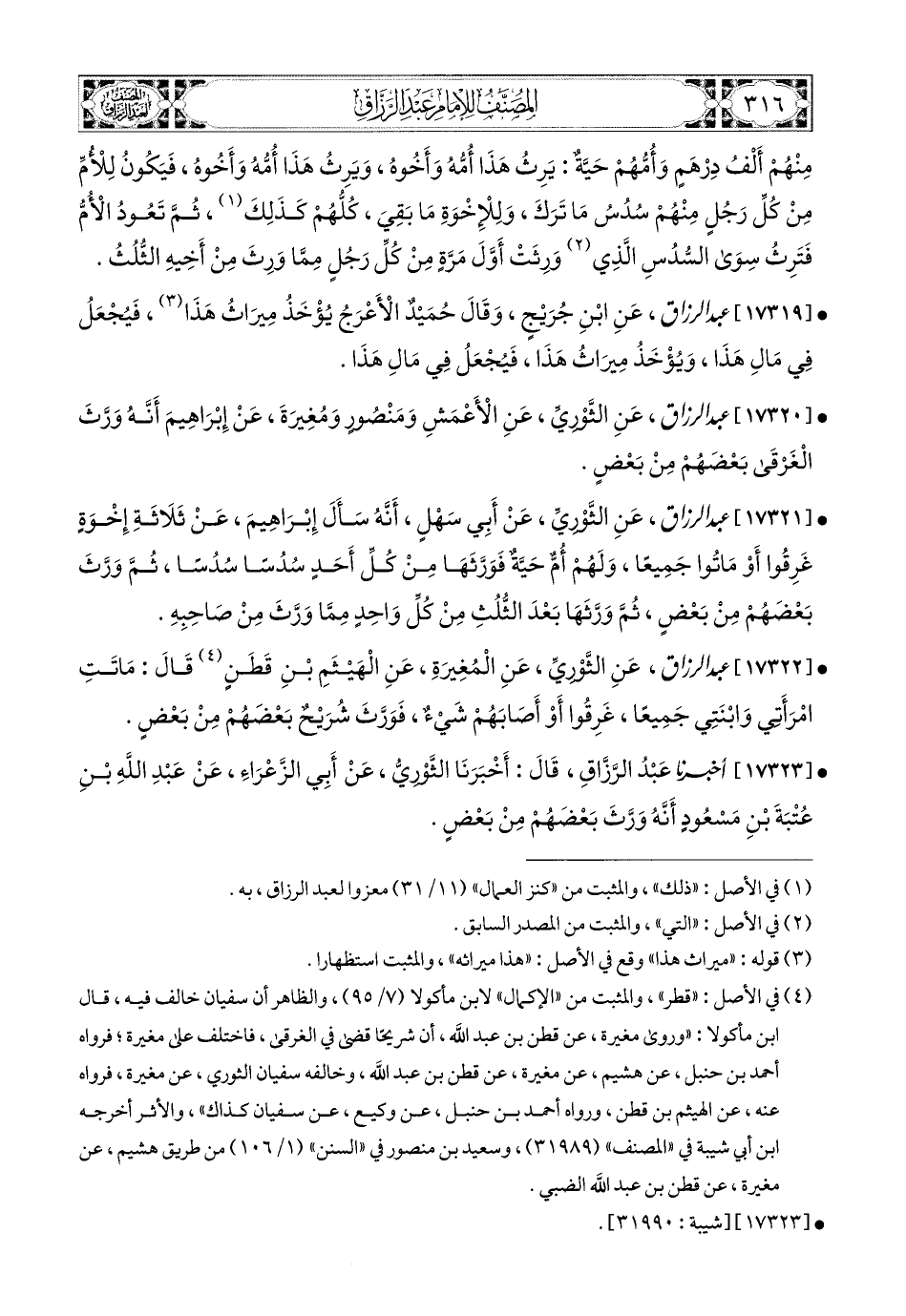 17321 - عبد الرزاق، عَنِ الثَّورِيِّ، عَنْ أَبِي سَهْلٍ، أَنَّهُ سَأَلَ إِبرَاهِيمَ عَن ثَلاَثَةِ إِخْوَةٍ غَرِقُوا، أَوْ مَاتُوا جَمِيعًا، وَلَهُمْ أُمٌّ حَيَّةٌ، فَوَرَّثَهَا مِنْ كُلِّ أَحَدٍ سُدُسًا سُدُسًا (1)، ثُمَّ وَرَّثَ بَعْضَهُمْ مِنْ بَعْضٍ، ثُمَّ وَرَّثَهَا بَعْدَ الثُّلُثِ مِنْ كُلِّ وَاحِدٍ مِمَّا وَرِثَ مِنْ صَاحِبِهِ.