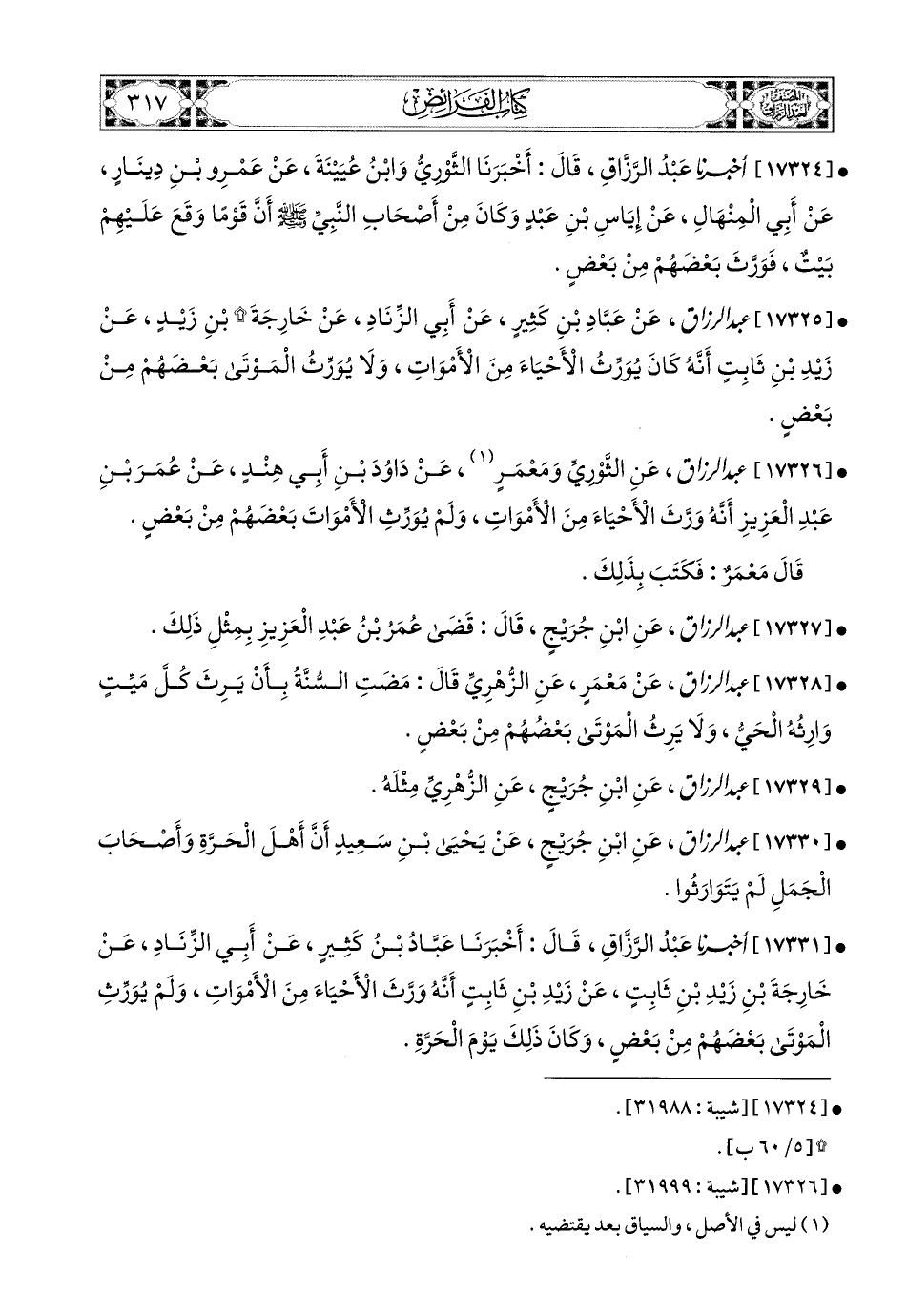17328 - عبد الرزاق، عَنْ مَعْمَرٍ، عَنِ الزُّهْرِيِّ، قَالَ: مَضَتِ السُّنَّةُ بِأَنْ يَرِثَ كُلُّ مَيِّتٍ وَارِثَهُ الْحَيَّ، وَلاَ يَرِثُ المَوْتَى بَعْضَهُمْ مِنْ بَعْضٍ (1).