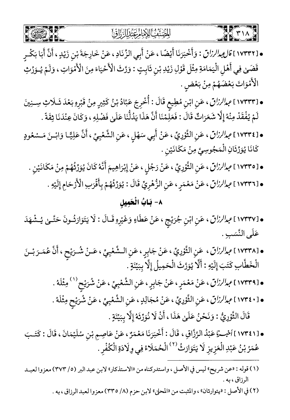17334- عبد الرزاق، عَنِ الثَّورِيِّ، عَنْ أَبِي سَهْلٍ، عَنِ الشَّعْبِيِّ، أَنَّ عَلِيًّا، وَابْنَ مَسْعُودٍ كَانَا يُوَرِّثَانِ المَجُوسي مِنْ مَكَانَيْنِ.
