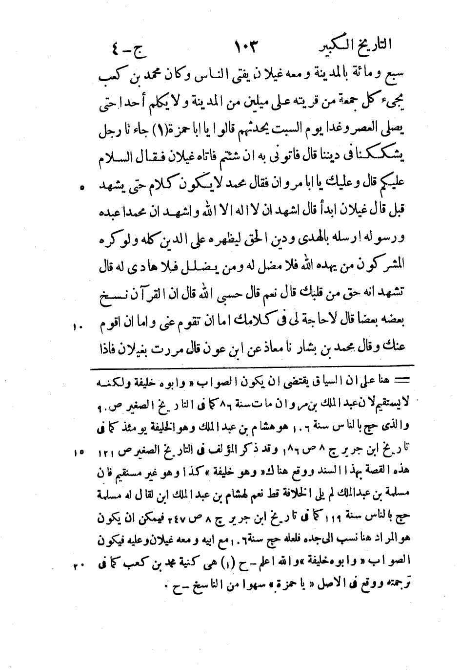 = هنا على ان السياق يقتضى ان يكون الصواب (وابوه خليفة ولكنه لا يستقيم لان عبد الملك بن مروان مات سنة 86 كما في التاريخ الصغير ص 90 والذى حج بالناس سنة 106 هو هشام بن عبد الملك وهو الخليفة يومئذ كما في تاريخ ابن جرير ج 8 ص 186 وقد ذكر المؤلف في التاريخ الصغير ص 121 هذه القصة بهذا السند ووقع هناك (وهو خليفة) كذا وهو غير مستقيم فان مسلمة بن عبد الملك لم يلى الخلافة قط نعم لهشام بن عبد الملك ابن لقال له مسلمة حج بالناس سنة 119 كما في تاريخ ابن جرير ج 8 ص 247 فيمكن ان يكون هو المراد هنا نسب إلى جده فلعله حج سنة 106 مع ابيه ومع غيلان وعليه فيكون الصواب (وابوه خليفة) والله اعلم - ح