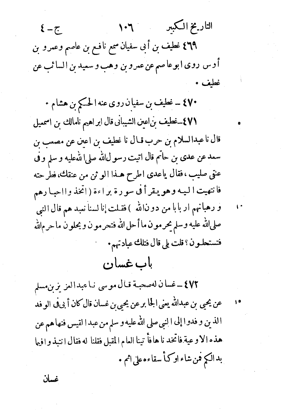 471 - غُطَيْفُ بْنُ أَعْيَنَ الشَّيْبَانِيُّ قَالَ إِبْرَاهِيمُ نا مَالِكُ بْنُ اسمعيل قَالَ نا عَبْدُ السَّلامِ بْنُ حَرْبٍ قَالَ نا غُطَيْفُ بْنُ أَعْيَنَ عَنْ مُصْعَبِ بْنِ سَعْدٍ عَنْ عَدِيِّ بْنِ حَاتِمٍ قَالَ أَتَيْتُ رَسُولَ اللَّهِ صَلَّى اللَّهُ عَلَيْهِ وَسَلَّمَ وَفِي عُنُقِي صَلِيبٌ، فَقَالَ يَا عَدِيُّ اطْرَحْ هَذَا الْوَثَنَ مِنْ عُنُقِكَ، فَطَرَحْتُهُ فَانْتَهَيْتُ إِلَيْهِ وَهُوَ يَقْرَأُ فِي سُورَةِ بَرَاءَةٍ (اتَّخَذُوا أَحْبَارَهُمْ وَرُهْبَانَهُمْ اربابا من دون الله) فَقُلْتُ إِنَّا لَسْنَا نَعْبُدُهُمْ قَالَ النَّبِيُّ صَلَّى اللَّهُ عَلَيْهِ وَسَلَّمَ يُحَرِّمُونَ مَا أَحَلَّ اللَّهُ فَتُحَرِّمُونَ وَيُحِلُّونَ مَا حَرَّمَ اللَّهُ