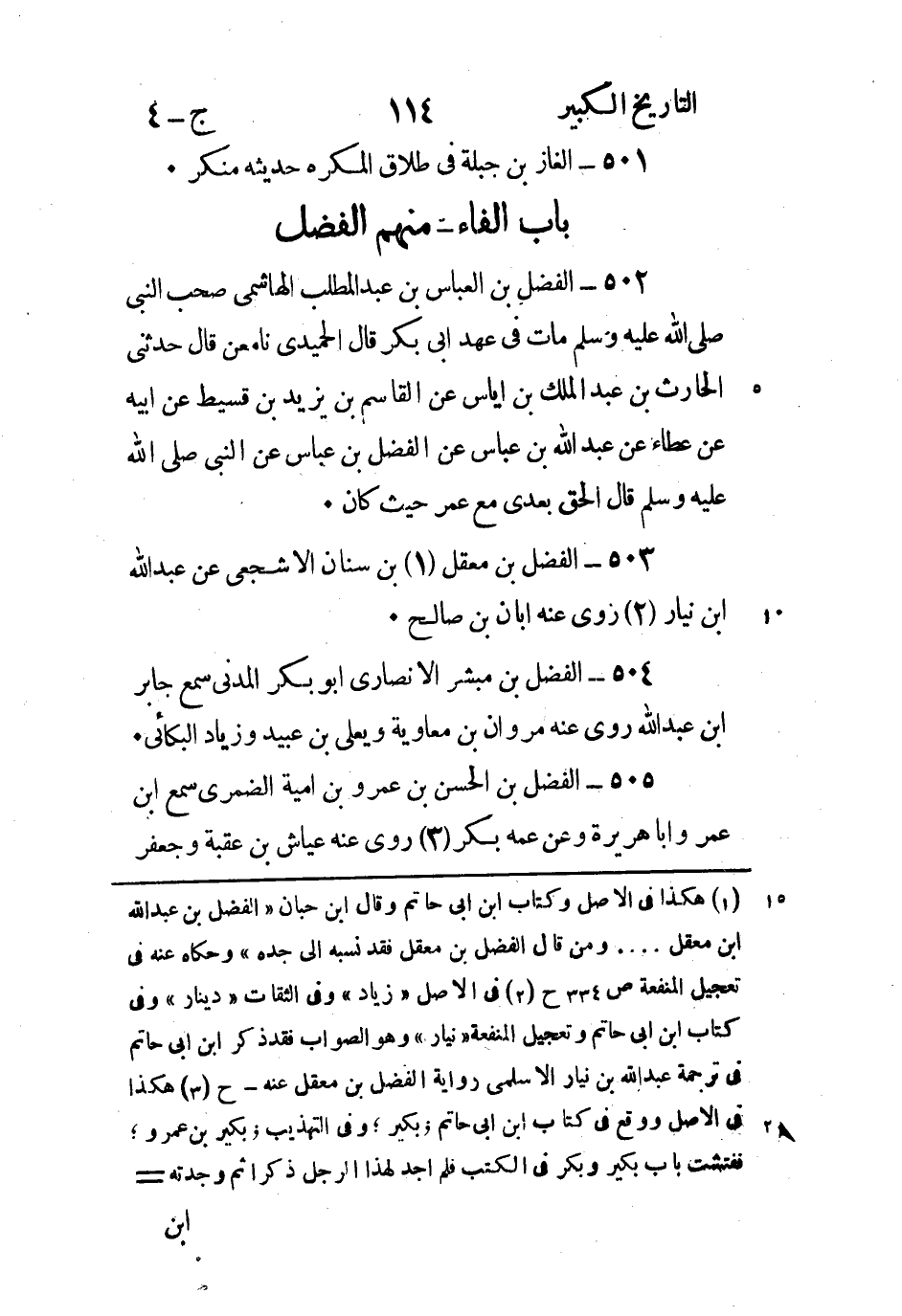 504 - الفضل بْن مبشر الْأَنْصَارِيّ أَبُو بكر الْمَدَنِيّ سَمِعَ جابر ابن عَبْد اللَّه روى عنه مروان بْن مُعَاوِيَة ويعلى بْن عُبَيْد وزياد البكائي.