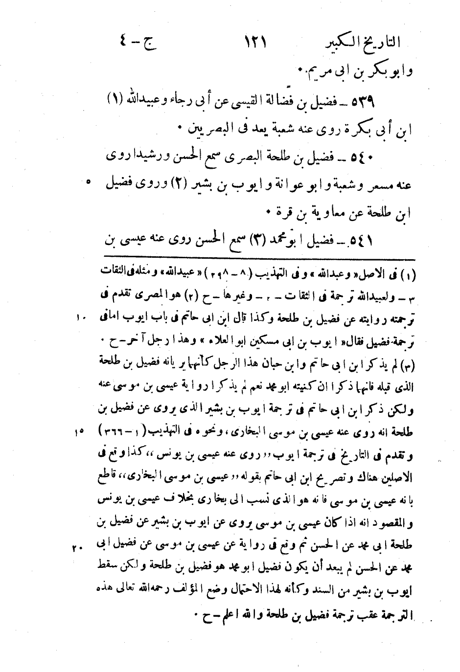 (3) لم يذكر ابن ابى حاتم وابن حبان هذا الرجل كأنهما يريانه فضيل بن طلحة الذى قبله فانهما ذكرا ان كنيته أبو محمد نعم لم يذكرا رواية عيسى بن موسى عنه ولكن ذكر ابن ابى حاتم في ترجمة ايوب بن بشير الذى يروى عن فضيل بن طلحة انه روى عنه عيسى بن موسى البخاري، ونحوه في التهذيب (