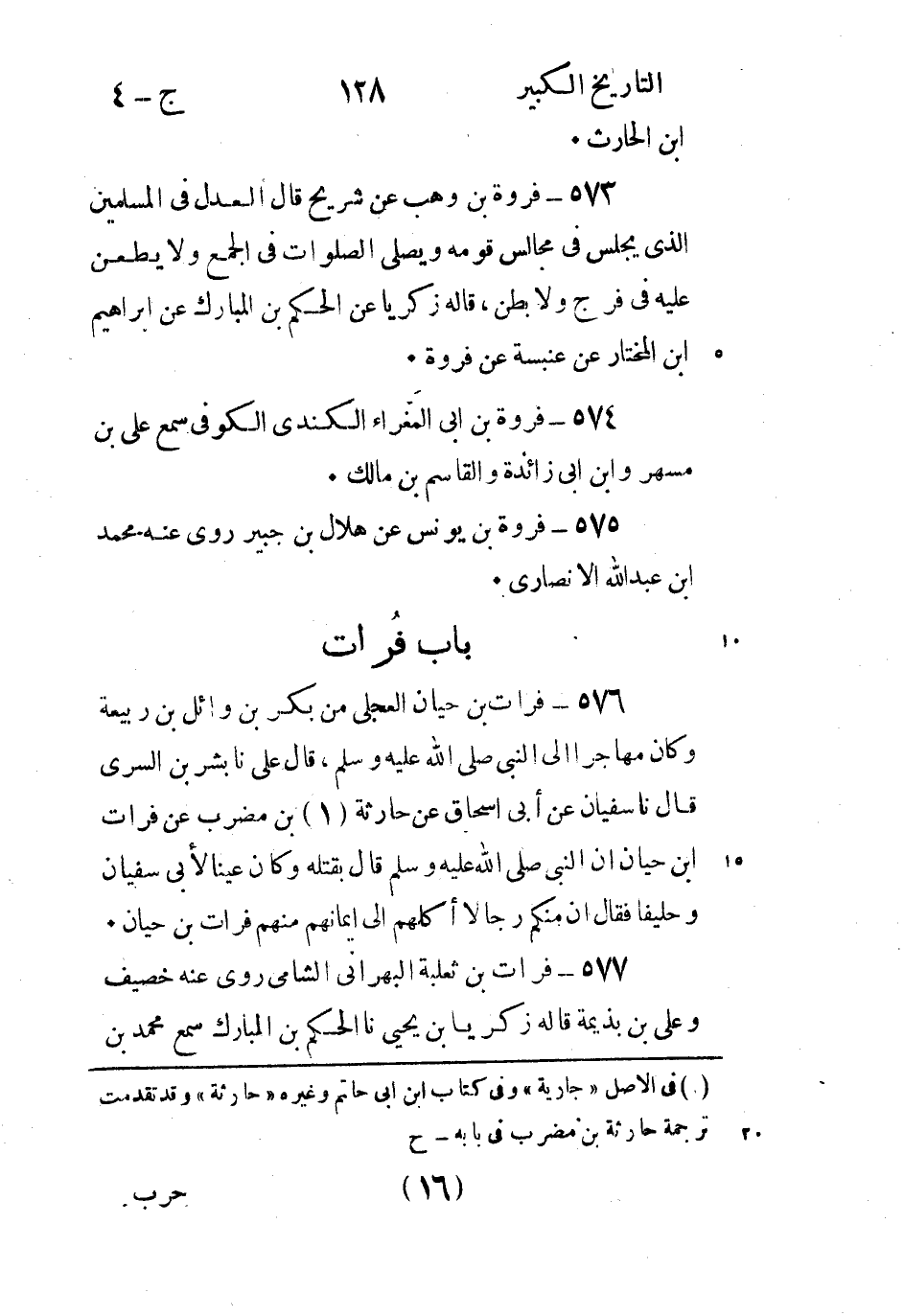 576 - فرات بْن حيان العجلي مِنْ بَكْرِ بْنِ وَائِلِ بْنِ رَبِيعَةَ وَكَانَ مُهَاجِرًا إِلَى النَّبِيّ صَلَّى اللَّهُ عَلَيْهِ وَسَلَّمَ، قَالَ عَلِيٌّ نا بِشْرُ بْنُ السُّرِّيِّ قَالَ نا سُفْيَانُ عَنْ أَبِي إِسْحَاق عَنْ حارثة (1) بْن مضرب عن فرات ابن حَيَّانَ أَنّ النَّبِيَّ صَلَّى اللَّهُ عَلَيْهِ وَسَلَّمَ قَالَ بِقَتْلِهِ وَكَانَ عَيْنًا لأَبِي سُفْيَانَ وَحَلِيفًا فَقَالَ إِنَّ مِنْكُمْ رِجَالا أَكِلُهُمْ إِلَى أَيْمَانِهِمْ مِنْهُمْ فُرَاتُ بْنُ حَيَّانَ.