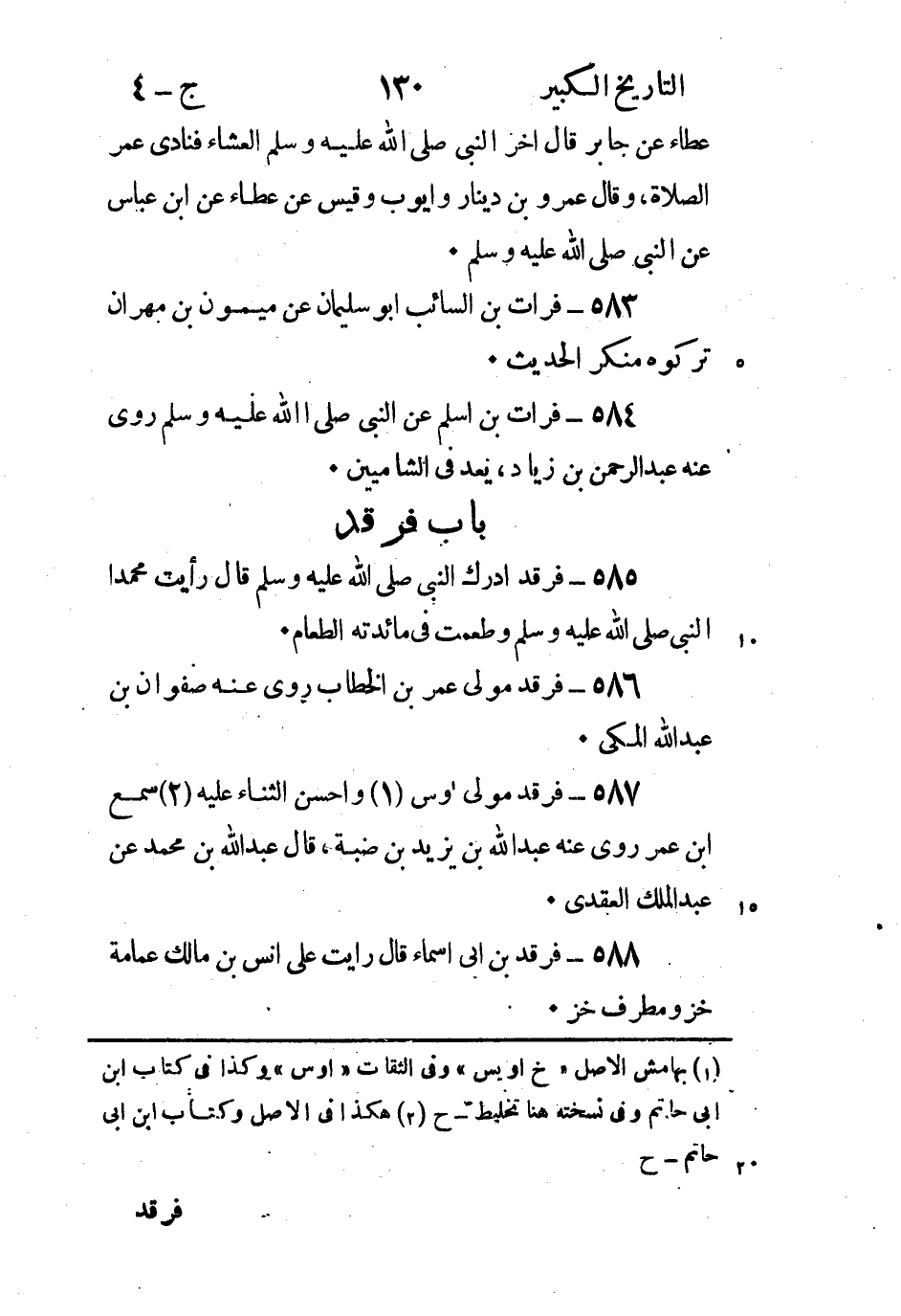587 - فرقد مولى أوس (1) وأحسن الثناء عليه (2) سَمِعَ ابْن عُمَر روى عَنْهُ عَبْد اللَّه بْن يزيد بْن ضبة، قَالَ عَبْد اللَّه بْن مُحَمَّد عَنْ عَبْد الملك العقدي.