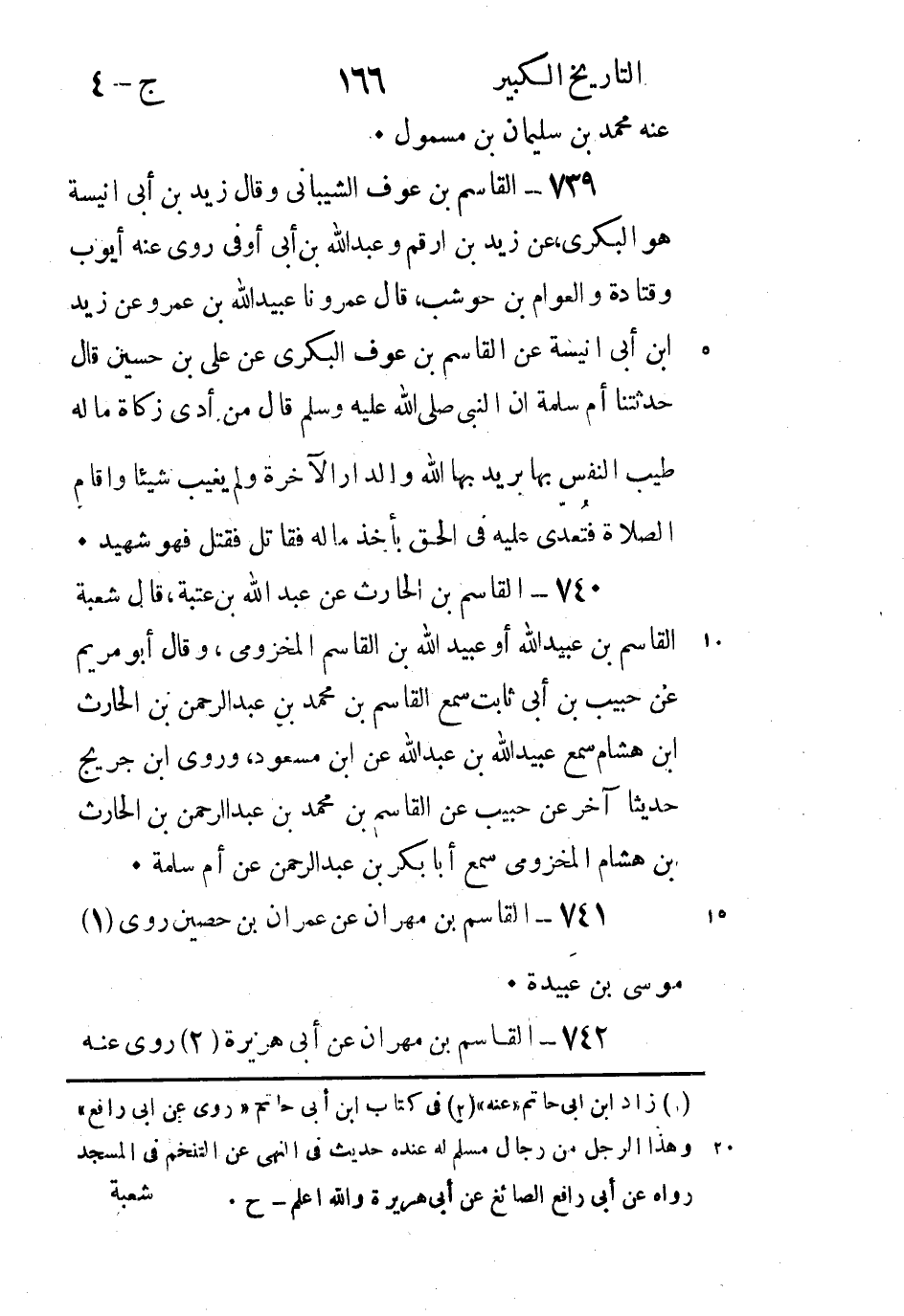 740 - القاسم بْن الحارث عَنْ عَبْد اللَّه بْن عتبة، قَالَ شُعْبَة القاسم بْن عُبَيْد اللَّه أو عُبَيْد اللَّه بْن القاسم المخزومي، وقَالَ أَبُو مريم عَنْ حبيب بْن أَبِي ثابت سَمِعَ القاسم بْن مُحَمَّد بْن عَبْد الرَّحْمَن بن الحارث ابن هشام سَمِعَ عُبَيْد اللَّه بْن عَبْد اللَّه عن ابن مسعود، وروى ابن جريج حديثا آخر عَنْ حبيب عَنِ القاسم بْن مُحَمَّد بْن عَبْد الرَّحْمَن بْن الحارث بْن هِشَام المخزومي سَمِعَ أبا بكر بْن عَبْد الرَّحْمَن عَنْ أم سلمة.
