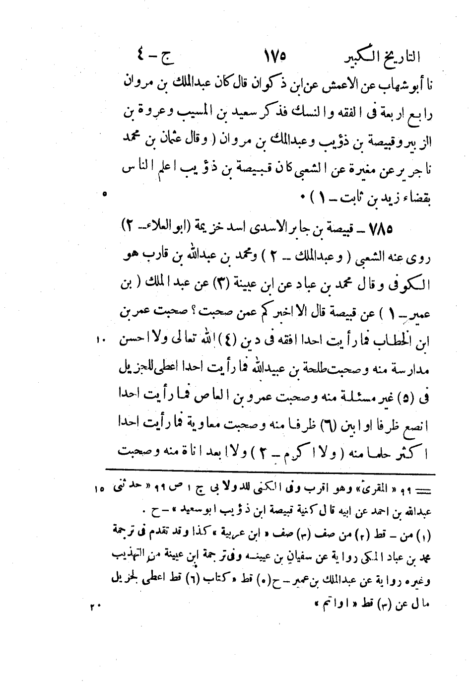 785 - قبيصة بْن جَابِر الأسدي أسد خزيمة (أَبُو العلاء - 2) روى عنه الشَّعْبِيّ (وعبد الملك - 2) ومُحَمَّد بْن عَبْد اللَّه بْن قارب هو الكوفِي وقَالَ مُحَمَّد بْن عباد عن ابن عيينة (3) عَنْ عَبْد الملك (بْن عمير - 1) عَنْ قبيصة قَالَ ألا أخبركم عمن صحبت؟ صحبت عمر بن ابن الْخَطَّاب فما رأيت أحدا أفقه فِي دين (4) اللَّه تعالى ولا أحسن مدارسة منه وصحبت طلحة بْن عُبَيْد اللَّه فما رأيت أحدا أعطى للجزيل فِي (5) غير مسألة منه وصحبت عَمْرو بْن العاص فما رأيت أحدا أنصع ظرفا أو أبين (6) ظرفا منه وصحبت مُعَاوِيَة فما رأيت أحدا أكثر حلما منه (ولا اكرم - 2) ولا ابعد اناة منه وصحبت